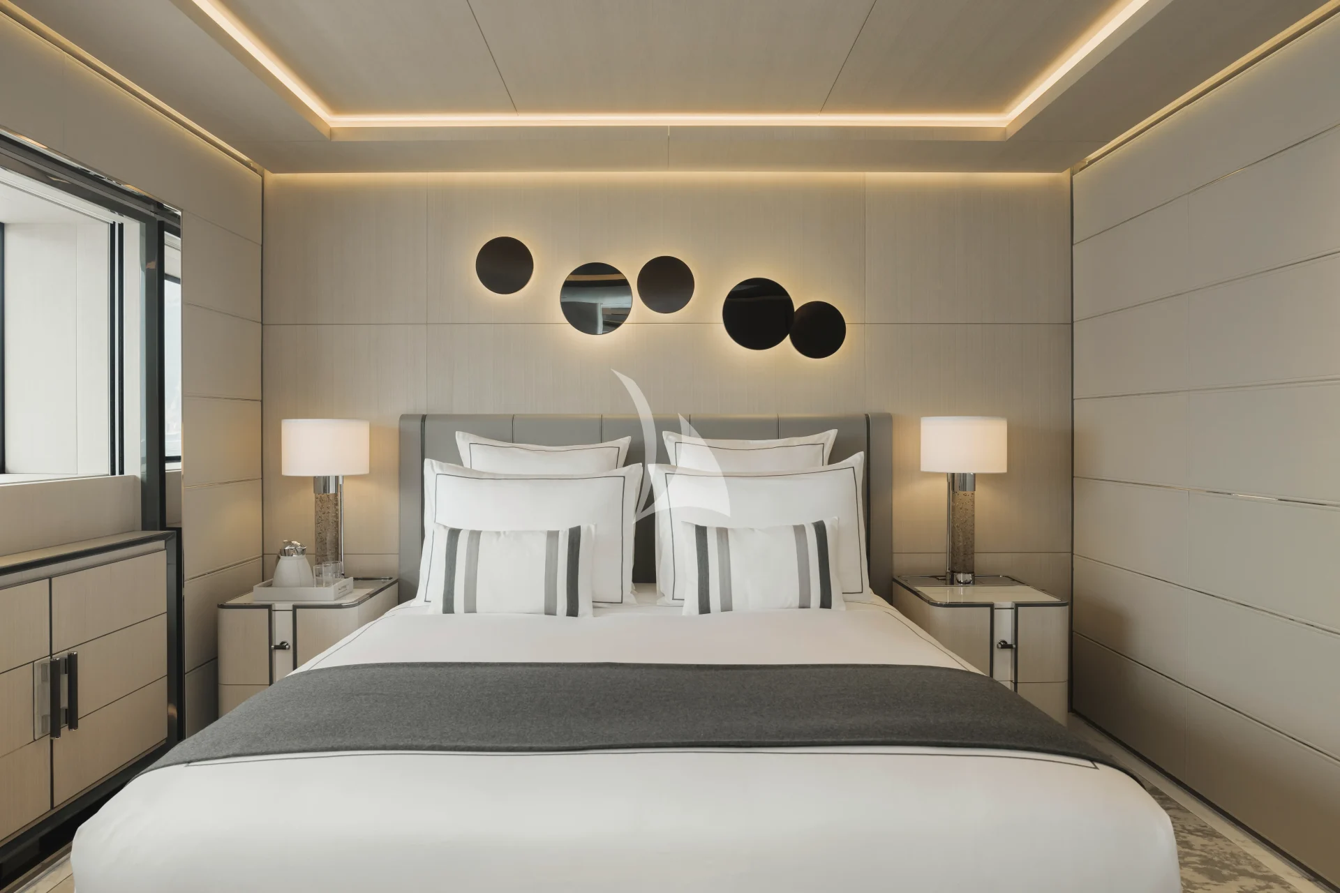 ALCHEMY provides flexible accommodation in six double cabins, one of which can be split into two single berths. The configuration includes a spectacular main deck owner’s suite, a VIP cabin on the upper deck and four remaining cabins located on the main and lower decks. A dynamic layout which allows plenty of space and privacy.