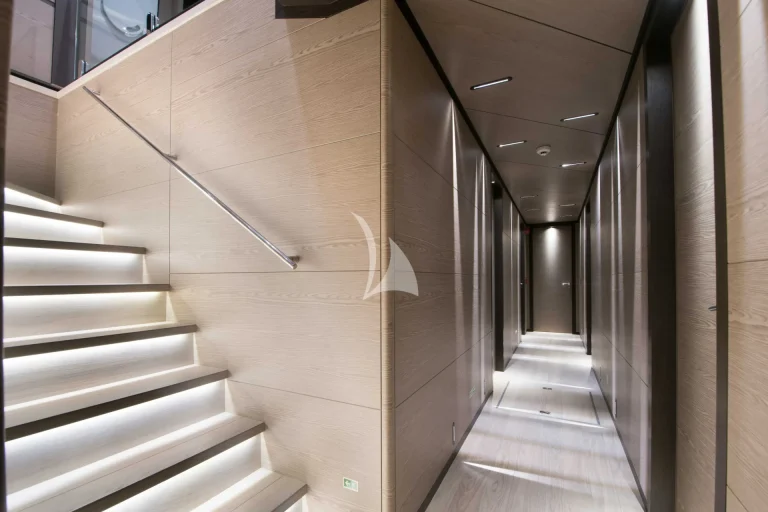 The deck spaces are absolutely stunning: a 70mq fly bridge, a very large stylish saloon, a cocktail cockpit in the front, the aft dining deck and the beach platform give the guests the opportunity to have their private or common space.