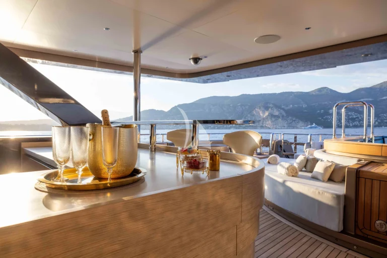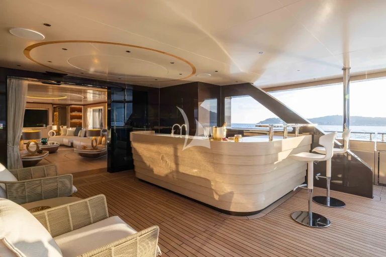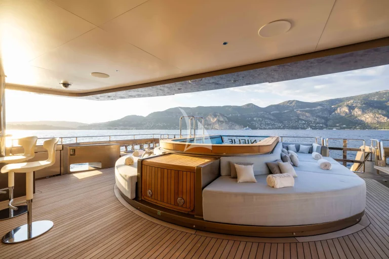 Guest accommodations comprise two VIP doubles that convert into a full-beam suite and two convertible twin/doubles. The upper deck offers sun pads, outdoor dining for 10, and an indoor dining room, while the helipad transforms into an open-air cinema for unforgettable evenings.