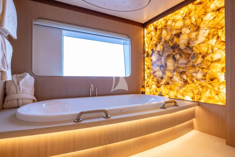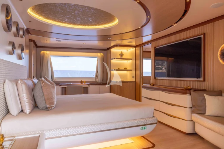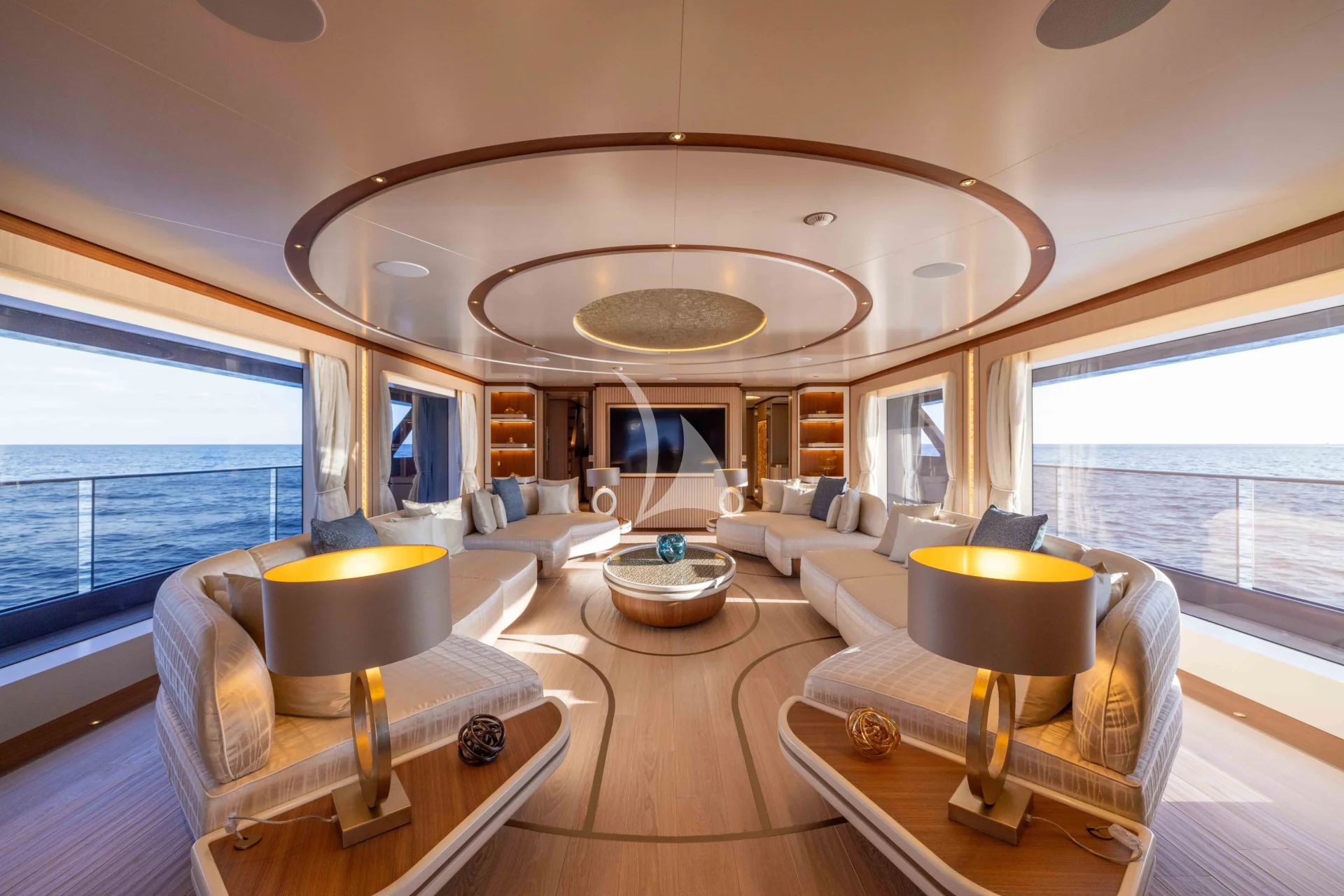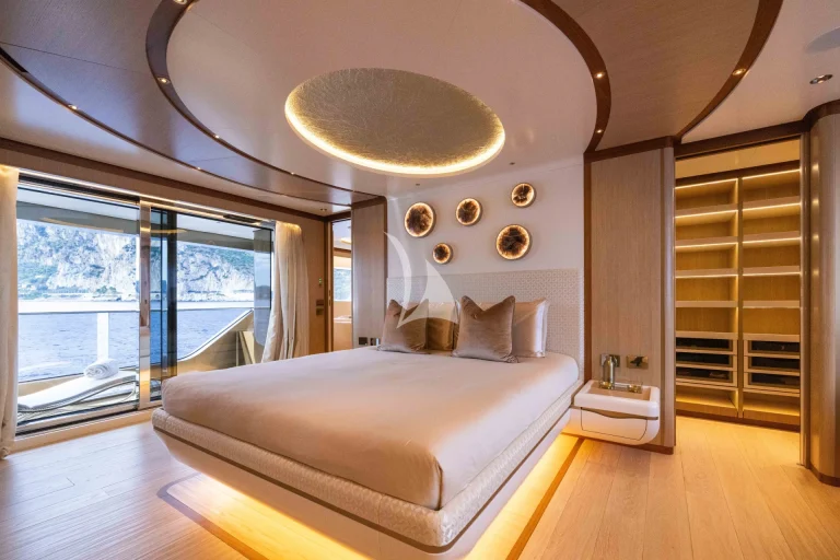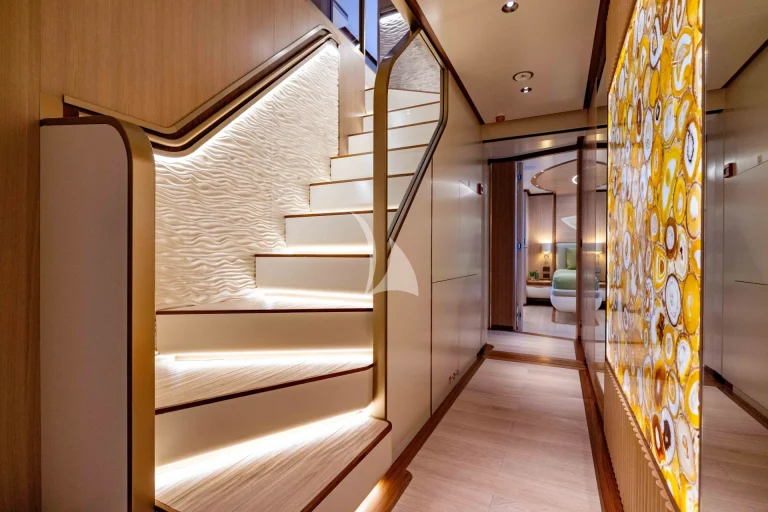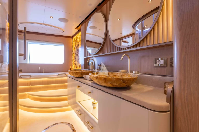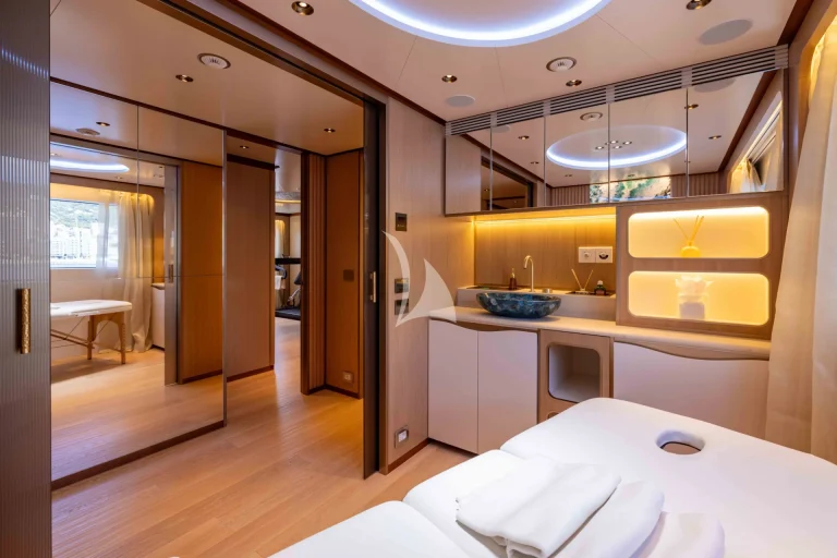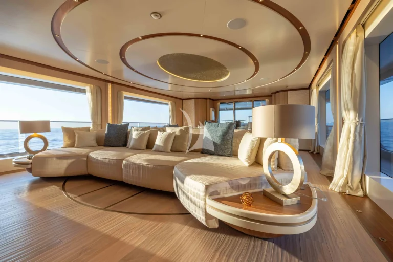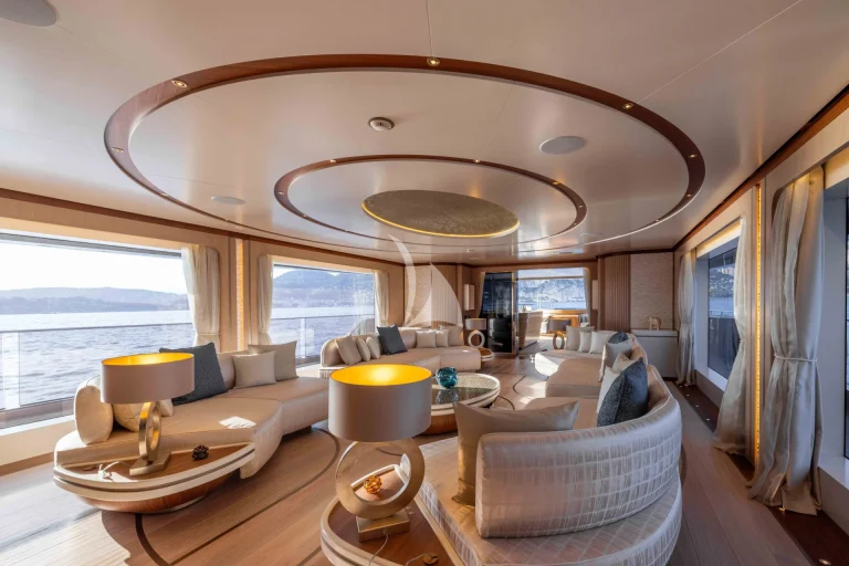 Interiors highlight natural, eco-friendly materials like Taurini stones, chosen by the owner for their cleansing properties, oak finished with various textures and canaletto walnut. The main salon boasts floor-to-ceiling views, a large TV, and rotating sofas for versatile layouts. Advanced air sanitation technologies ensure a purified onboard environment.
