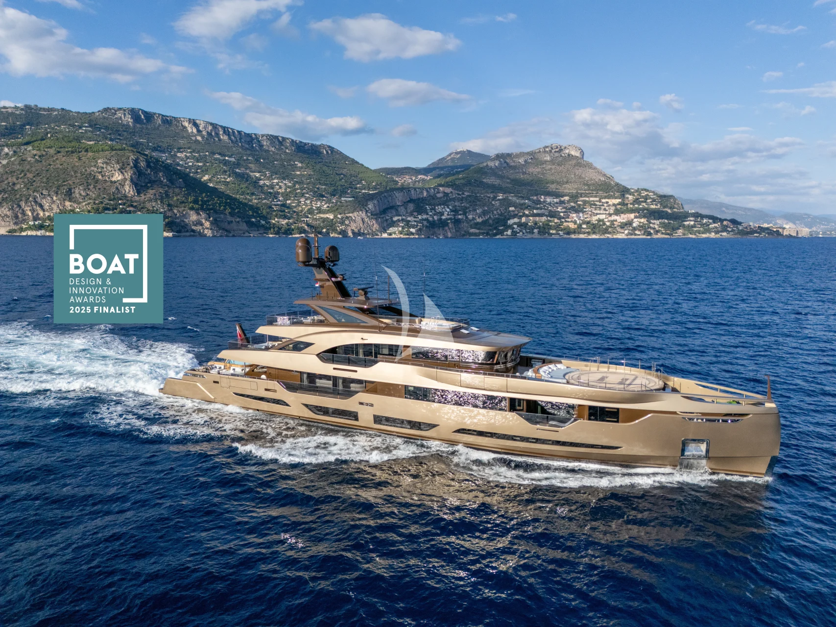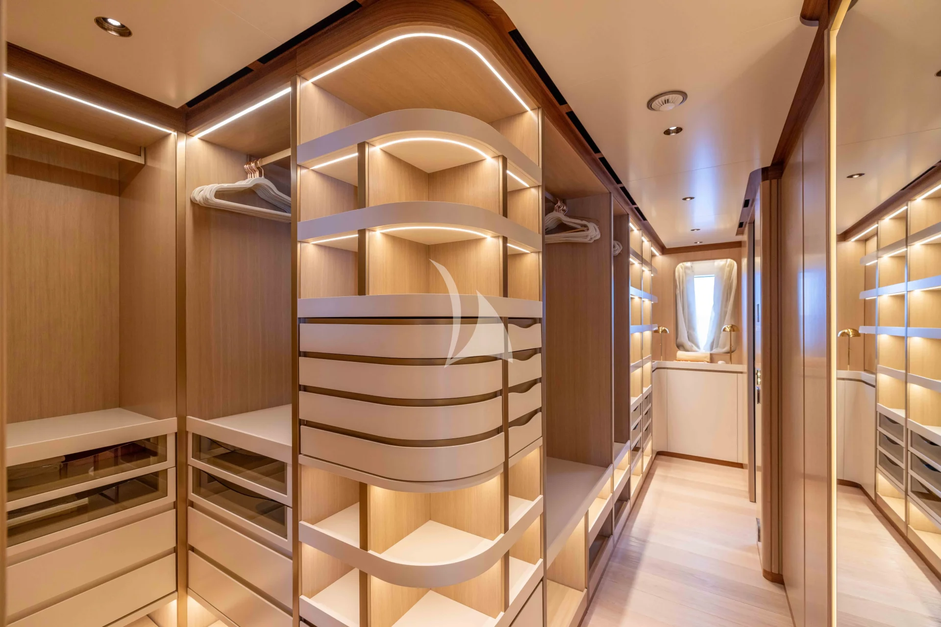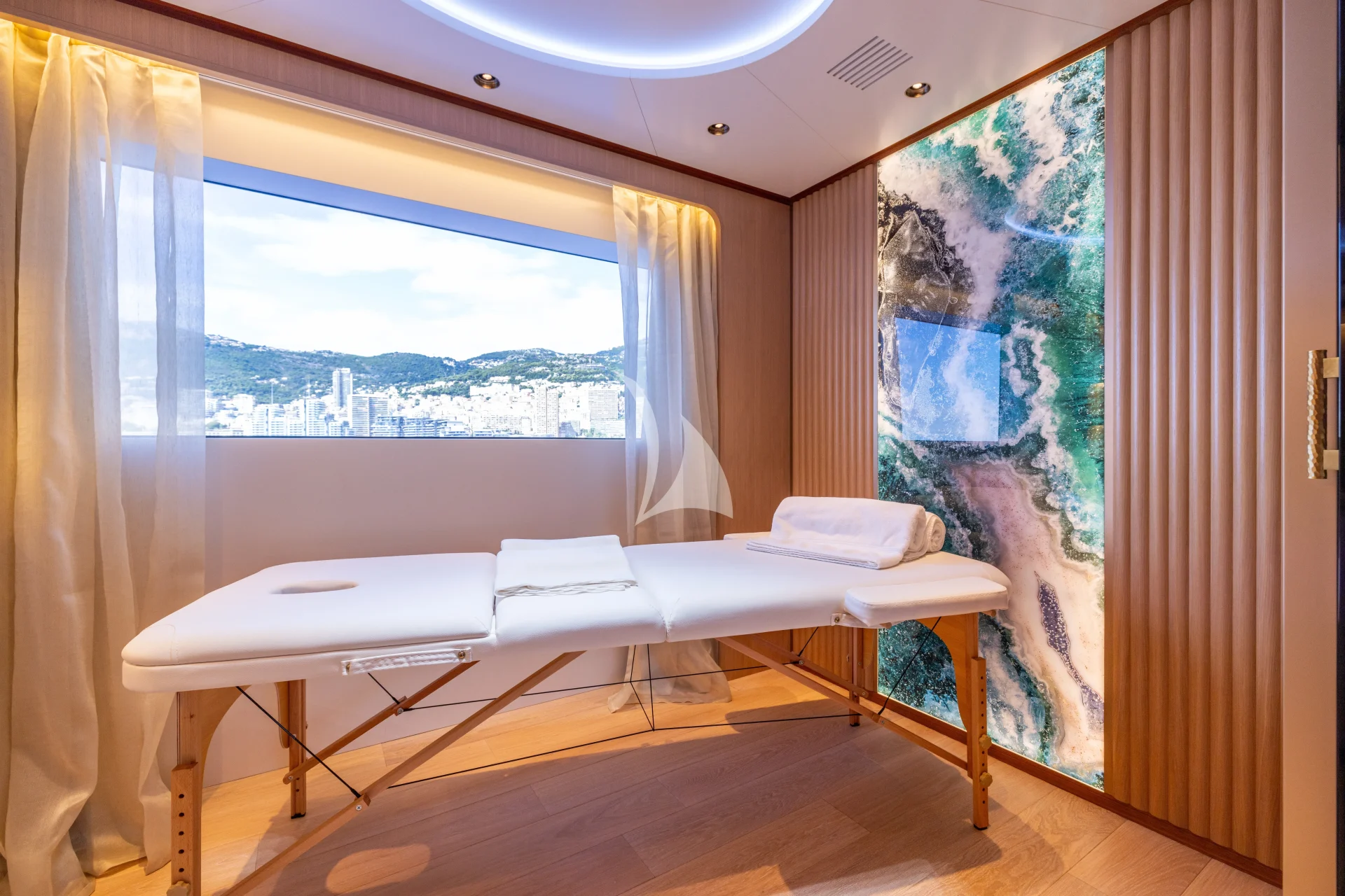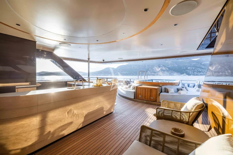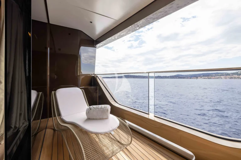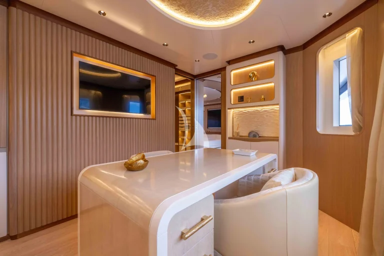 Interiors highlight natural, eco-friendly materials like Taurini stones, chosen by the owner for their cleansing properties, oak finished with various textures and canaletto walnut. The main salon boasts floor-to-ceiling views, a large TV, and rotating sofas for versatile layouts. Advanced air sanitation technologies ensure a purified onboard environment.