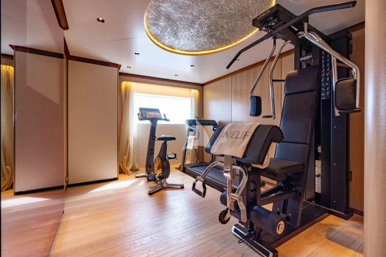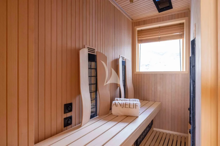 The owner’s suite includes a massage room, Technogym-equipped gym, study, L-shaped walk-in wardrobe, full-beam master cabin with private balcony, and ensuite bathroom with a window-edge Jacuzzi, mosaic shower/hammam, and infrared sauna.