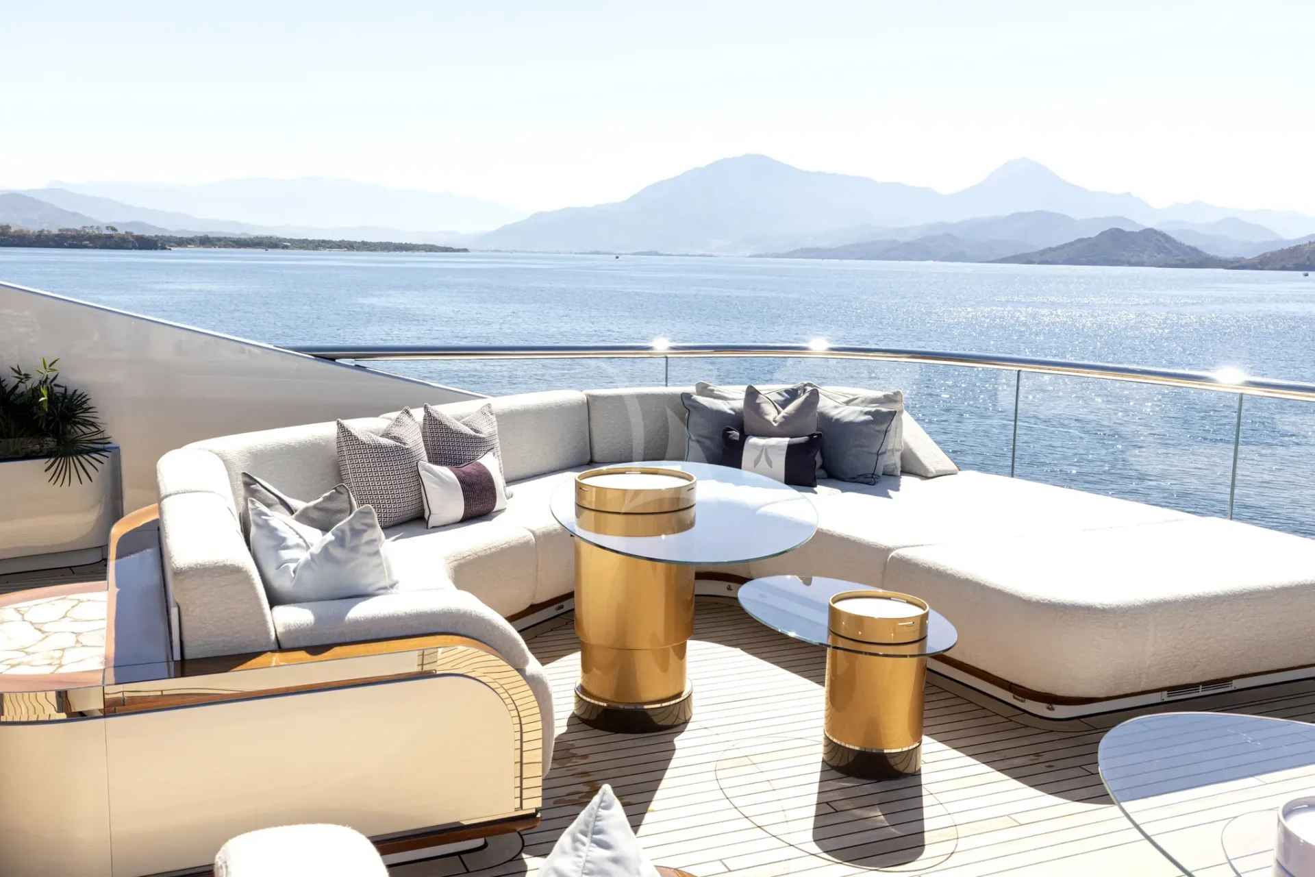 Charter guests will love her exquisite sun deck, with its partially transparent Jacuzzi with sunpads forward, pizza oven and barbecue area, gym – which can be either open or enclosed – a cool sit-up bar and lots of lounging options, including C-shaped sofas aft with more infinity views.