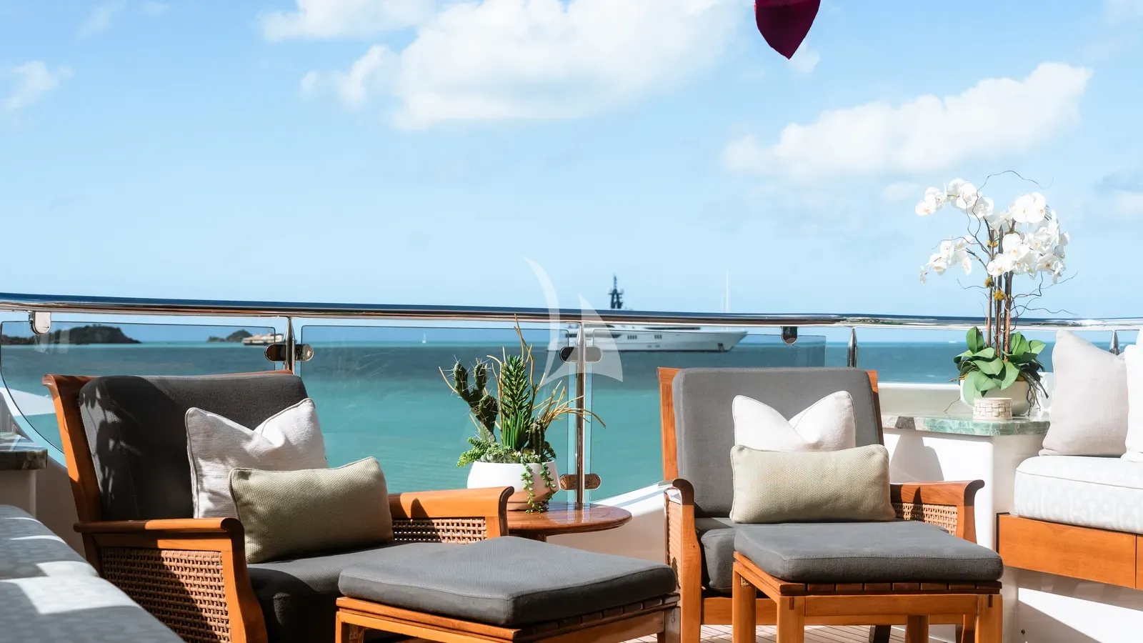 The spacious sun deck offers a variety of options for al fresco lounging in and out of the sun. The center section is comprised of a counter top with 6 stools, an L-shaped sofa, 2 cocktail tables and 2 arm chairs. All the way forward is a large Jacuzzi with a wrap-around sunpad. The aft deck space is equipped with chaise lounge chairs for the those looking to enjoy the sun. This deck is accessed via the stairs on the port side leading up from Bridge Deck. A BBQ grill is conveniently located on the sun deck.
