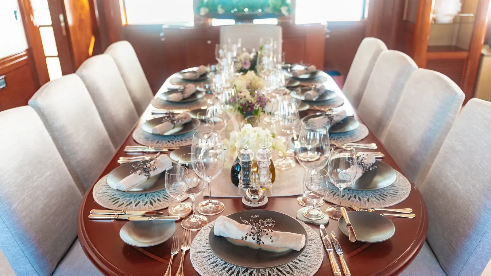 The main aft deck has a large dining table aft that can accommodate up to 16 guests with free-standing chairs. On the forward port side is a full-service bar with three bar stools and television fitted on the aft bulk head.