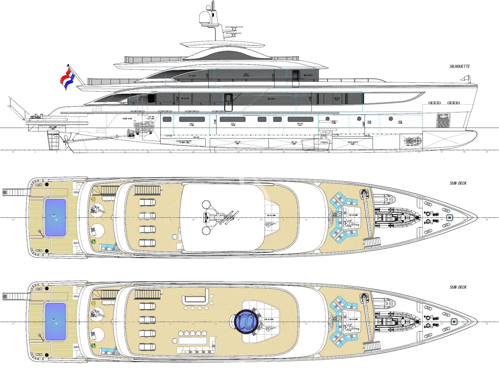 The sundeck is designed for ultimate relaxation and entertainment, offering a spacious layout with a variety of luxurious amenities. A dedicated sunbathing area is equipped with comfortable sunbeds, ideal for soaking up the sun throughout the day.
