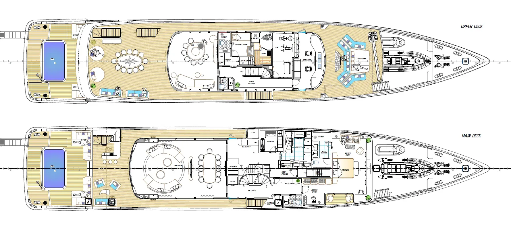 The swim platform and beach club area offer effortless access to the water. This spacious zone features a comfortable lounge area and sun loungers, providing the perfect setting for unwinding at the water’s edge. A standout feature is the Wave Pool/Jacuzzi, measuring 4.20m x 2.20m, ideal for refreshing dips or soaking in comfort while enjoying proximity to the sea. Just a few steps, takes guests up to the main deck.