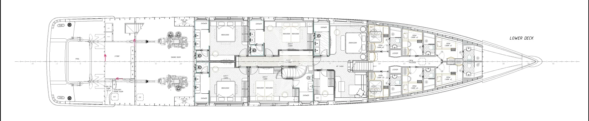 Moving aft, two convertible cabins are amidships followed by two queen sized guest cabins.
