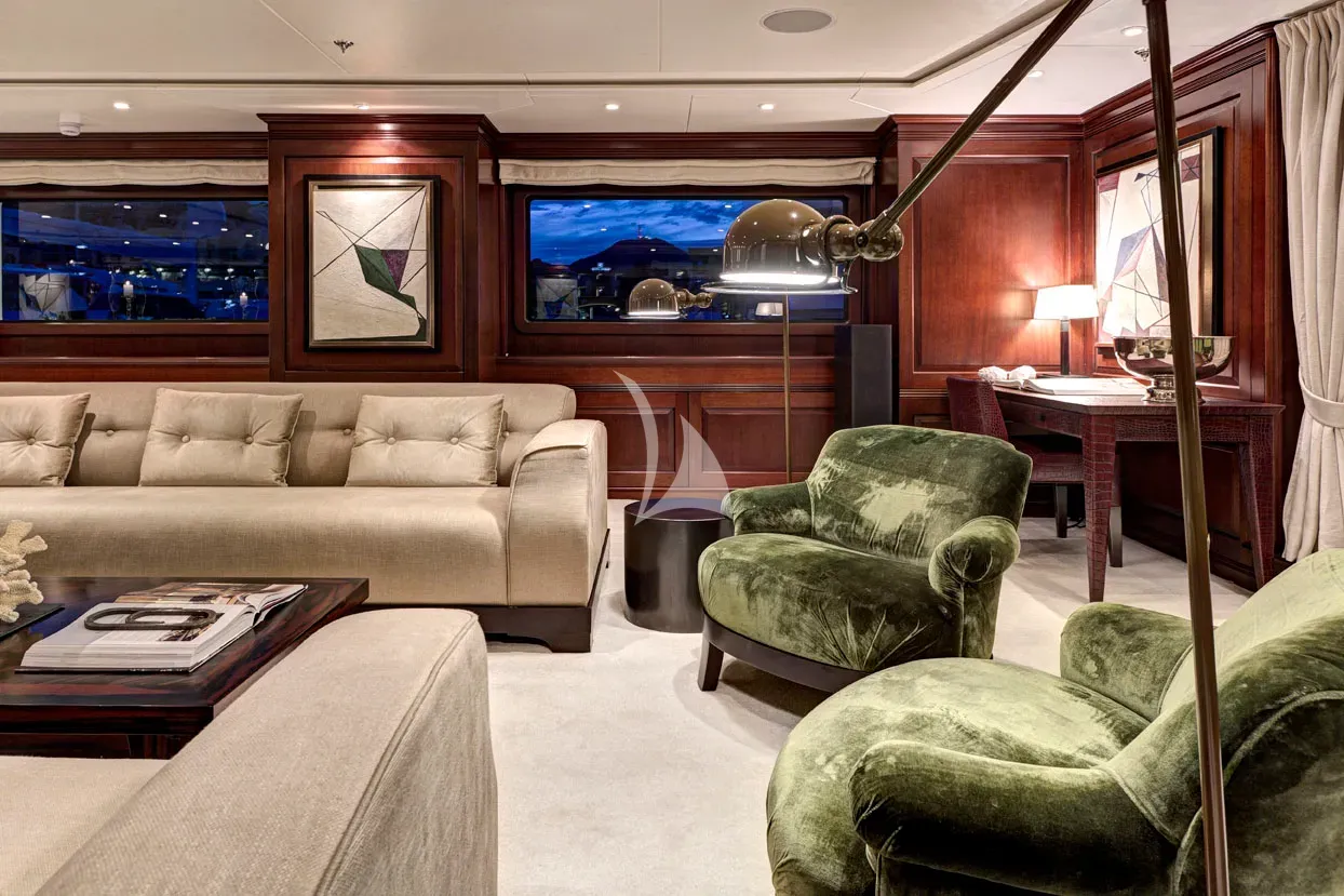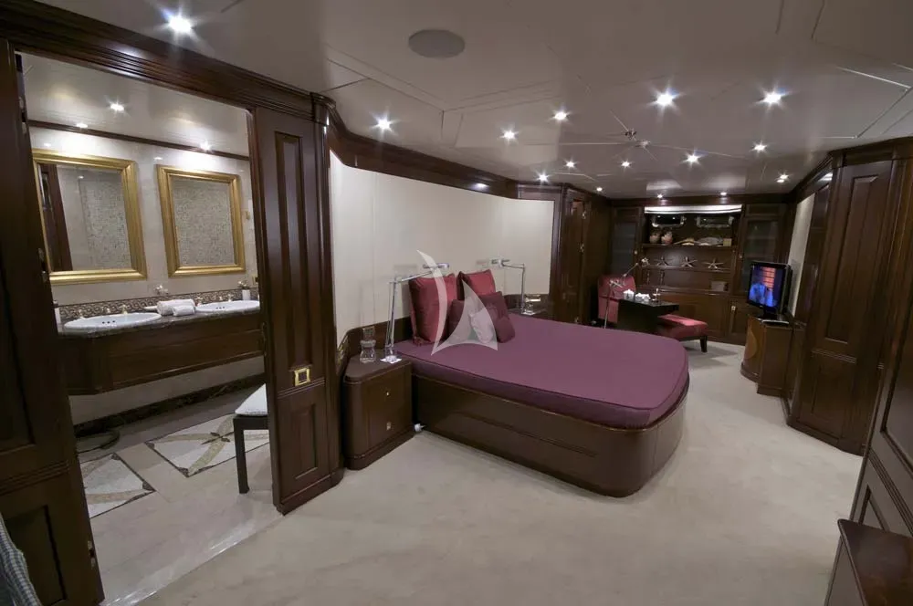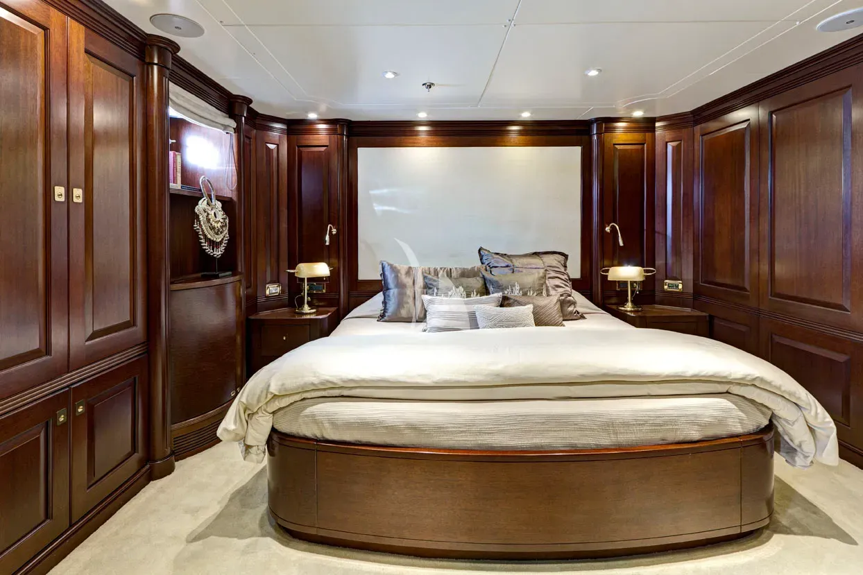 The full beam Owners suite is located on main deck, with the full beam VIP suite and four guest cabins located on lower deck.