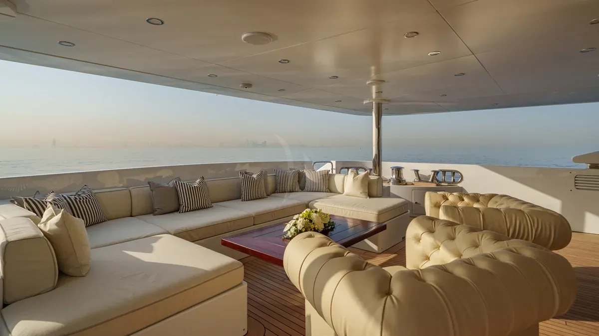 She features a full-displacement GRP hull and an aluminium superstructure, complemented by elegant teak decks. With a beam of 9.20 metres and a draft of 2.70 metres, BOMBAY boasts a generous interior volume of 487 GT.