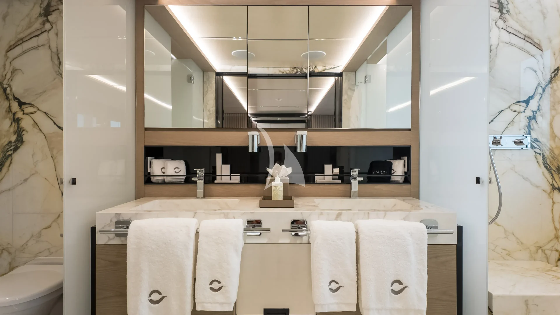 C can comfortably accommodate up to 12 guests across seven cabins with incredible flexibility. The yacht has two master suites and two VIP suites located on the main deck, and a large double cabin, twin cabin with trundle beds and pullman bunks, and a dedicated playroom/children’s cabin on the lower deck.