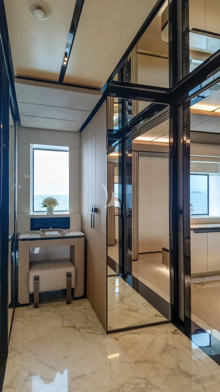 The main salon is carefully designed to accommodate modern family life and features floor-to-ceiling windows and retracting glass doors that reveal a balcony to one side. The sophisticated lounge is adorned with bespoke furniture by Italian designers Belvedere, alongside customised Minotti pieces. Every detail has been meticulously curated, from the plush new soft furnishings to the custom-designed carpets. The beautifully crafted dining table offers a luxurious dining setting with seating for 12. On the upper deck, guests will find another glamorous lounge space with a projector for movie nights.