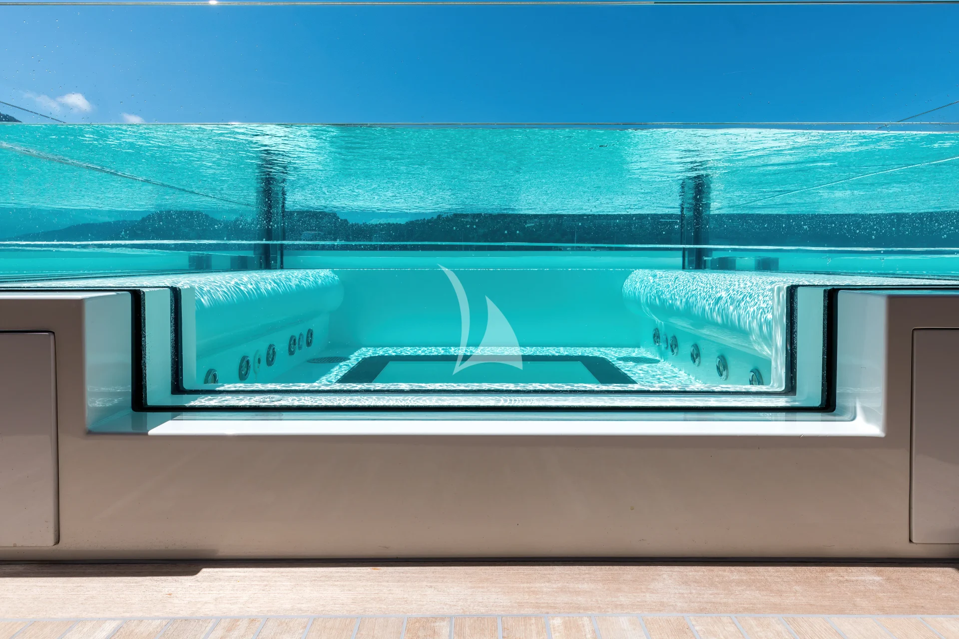 When it comes to exterior spaces, C has an amazing glass jacuzzi pool on the main deck, two extendable dining tables on the upper deck, as well as a circular seating area and second jacuzzi pool on the sundeck.