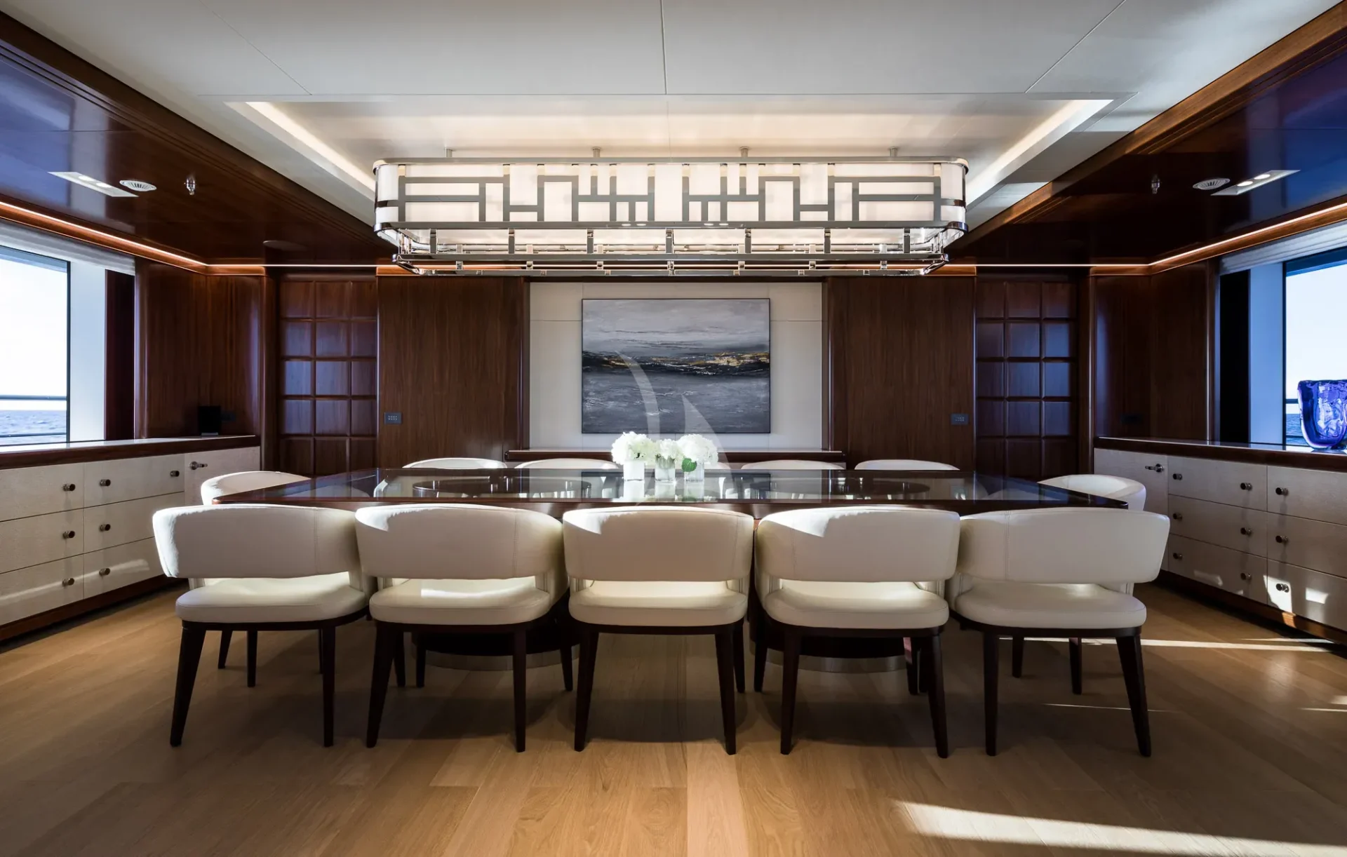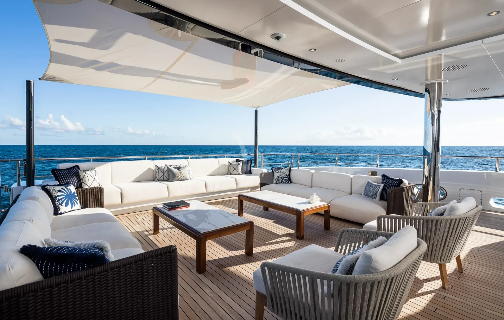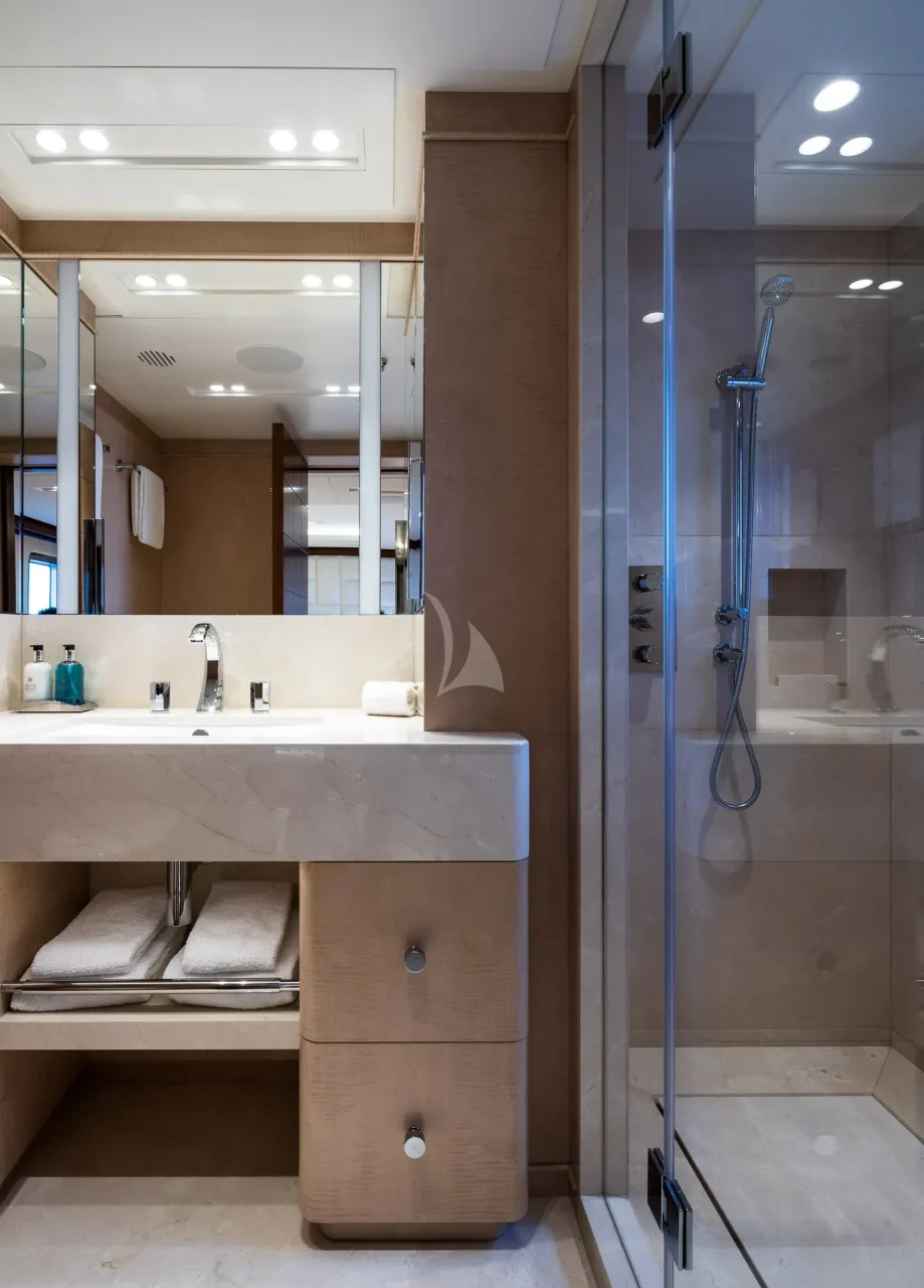 Her six guest cabins, two VIPs on the main deck, two kings and two convertible twins with Pullmans on the lower deck, all offer the same chic marble ensuite bathrooms. CALEX’s clever layout is extremely charter-friendly with versatile guest accommodation and a multitude of different zones on board for guests to enjoy depending on their mood.