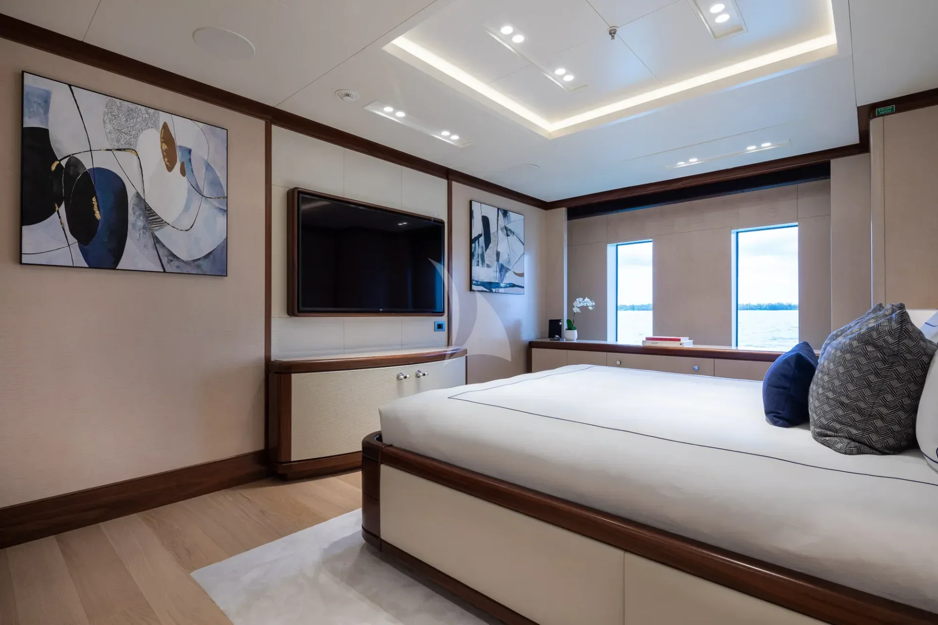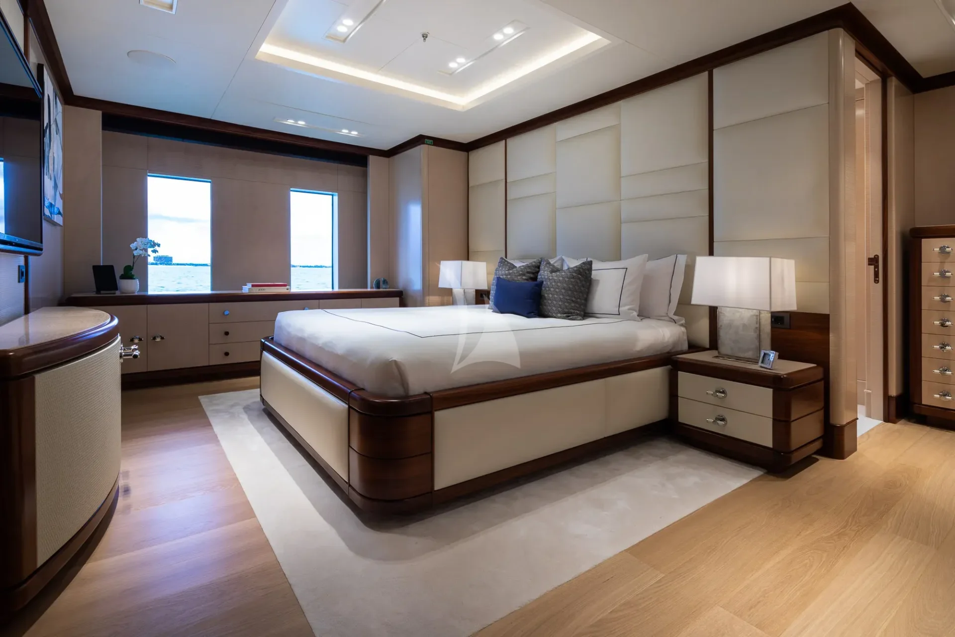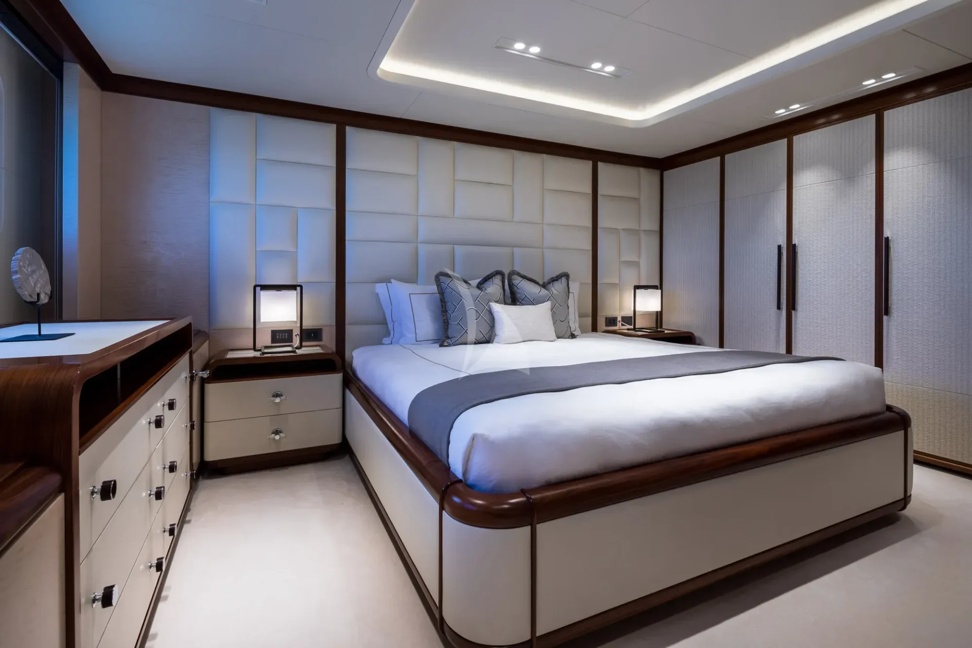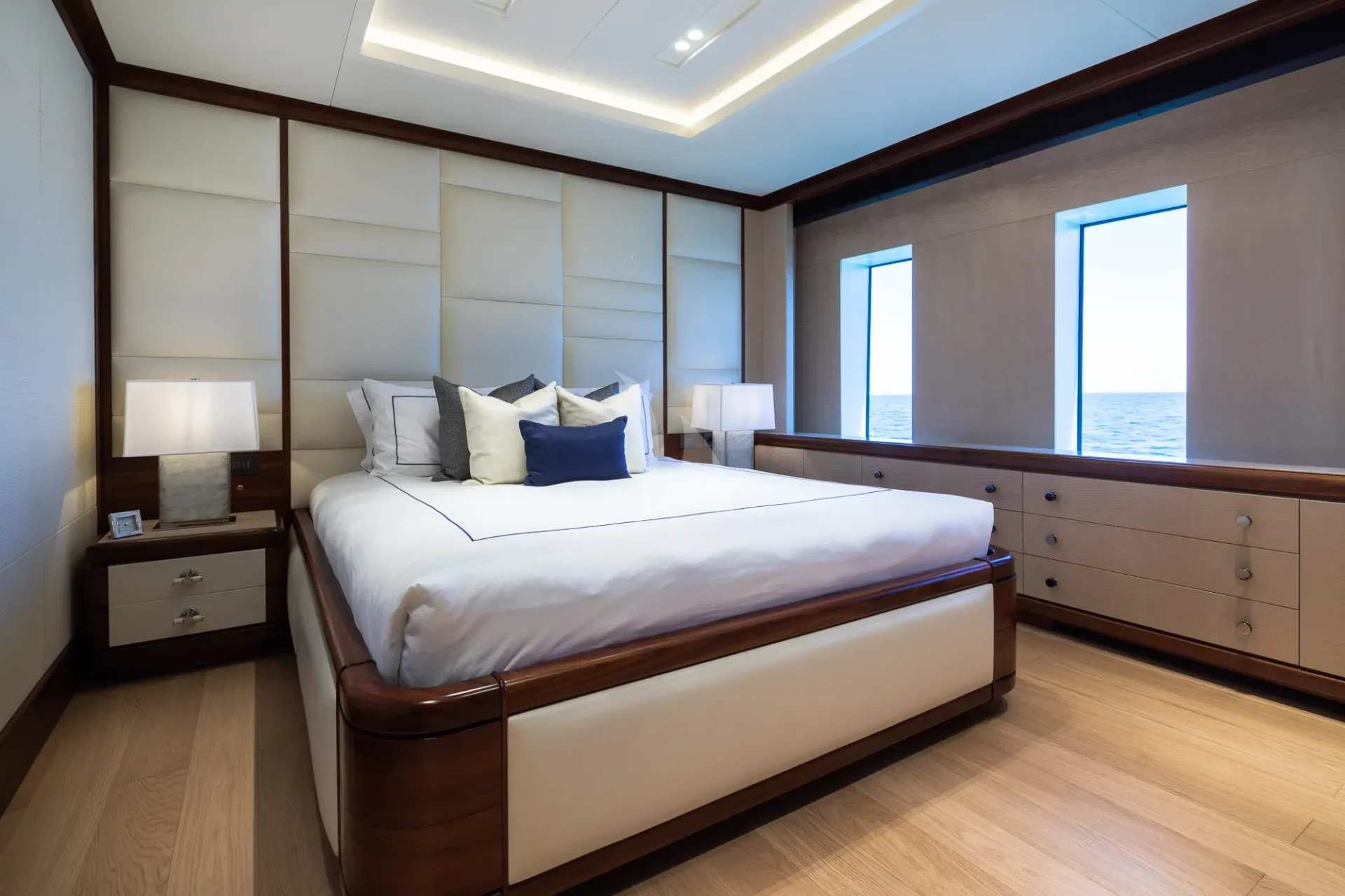 CALEX welcomes 12 guests in seven warm and modern staterooms. The vast master suite is situated on the upper deck with a clear focus on privacy and relaxation. With a private office, spa-like double bathroom and their own private foredeck, this is the epitome of on-water luxury. 180-degree views can be admired whilst in bed, or guests can head through the automatic doors to the completely private open-air hangout.