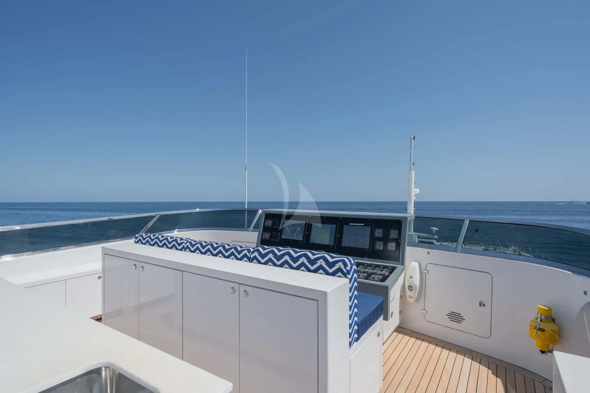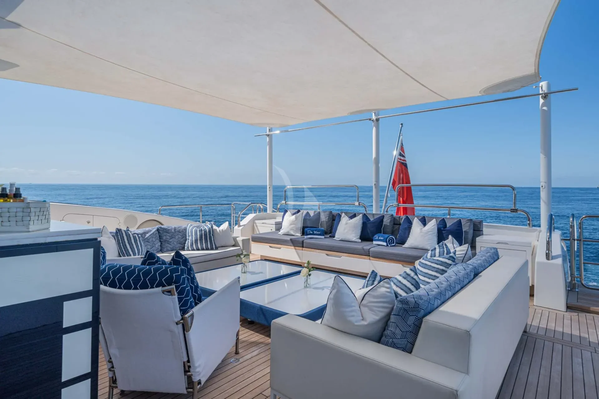 Her top performance does not outweigh the stunning style of this yacht. DA VINCI features blonde teak plank flooring and exceptionally wide side decks with impressive sightlines past the shapely superstructure. Her on-deck layout is extremely spacious. Another remarkable space is the spa pool and her bathing platform, which beckons guests to soak up the sun.
