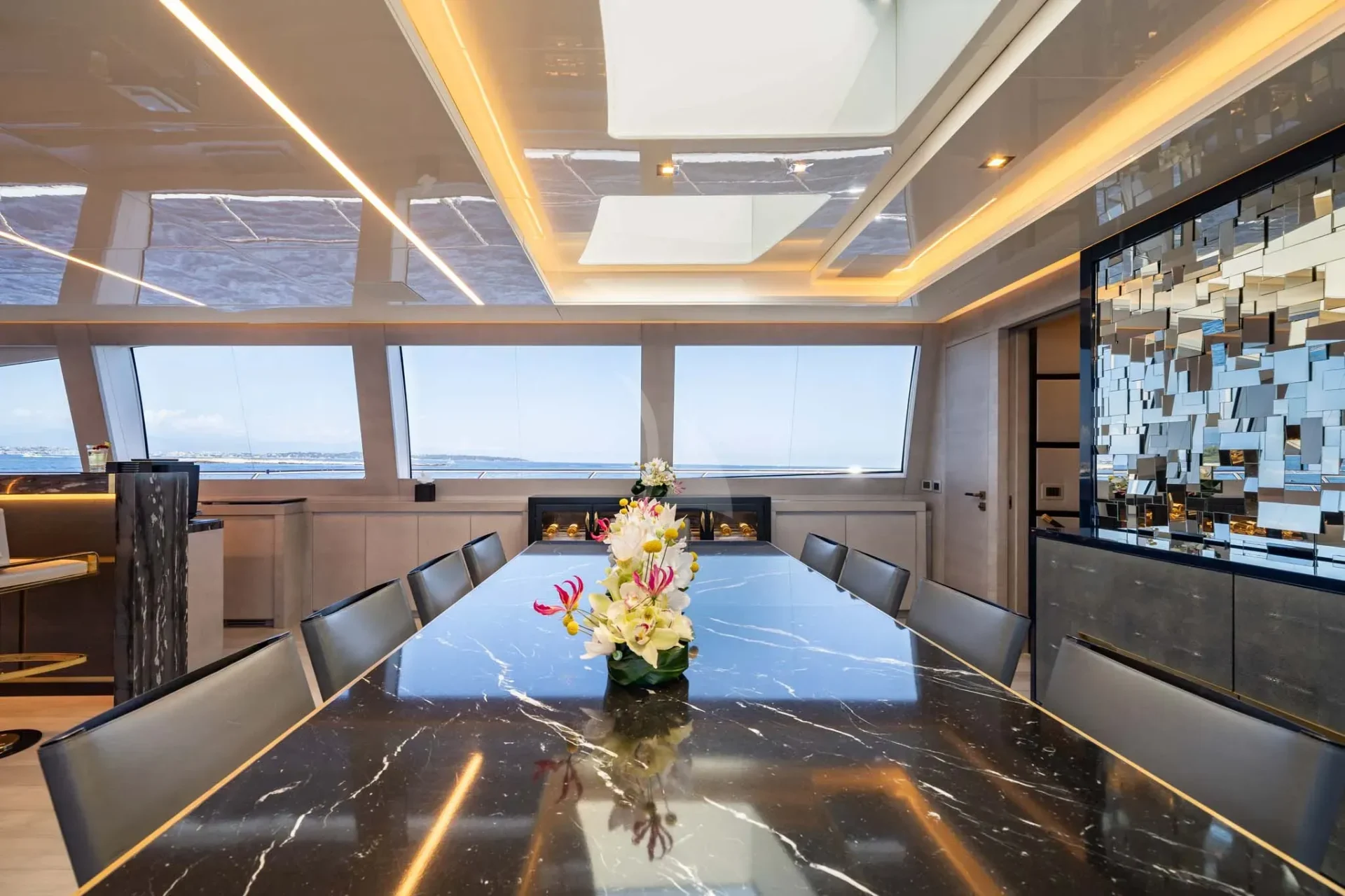 Indoors on DA VINCI, the main deck entertainment area is equally as spacious, with ample headroom. This space is further enhanced by natural light from large windows. The beautifully customized space has bleached oak flooring, a marble bar and a large sofa, which is as comfortable as it is elegant.