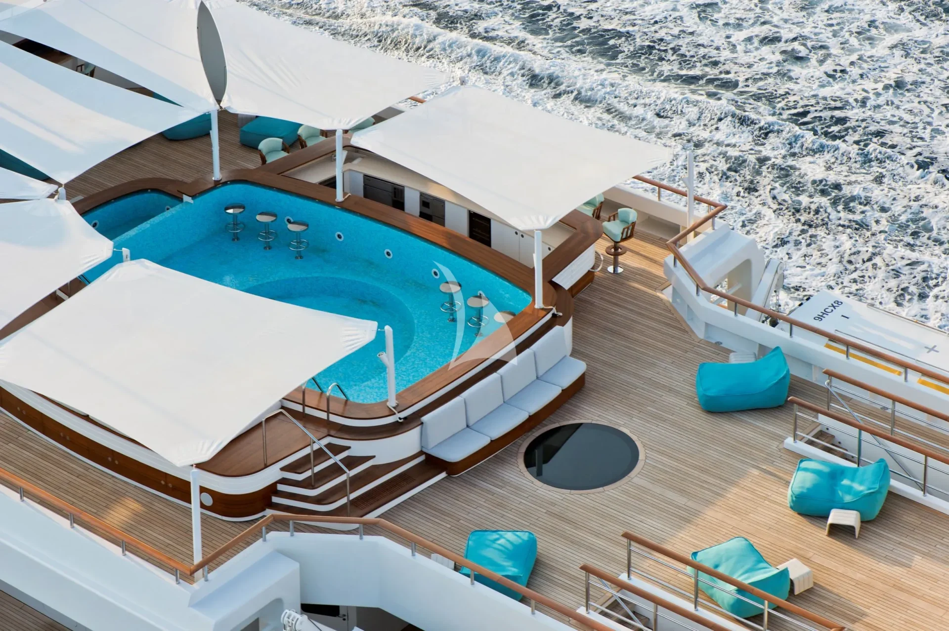 There are four separate salon areas which can be merged into one large area, which includes a fully fitted bar and a Yamaha Disklavier Grand Piano which can be streamed ship wide.