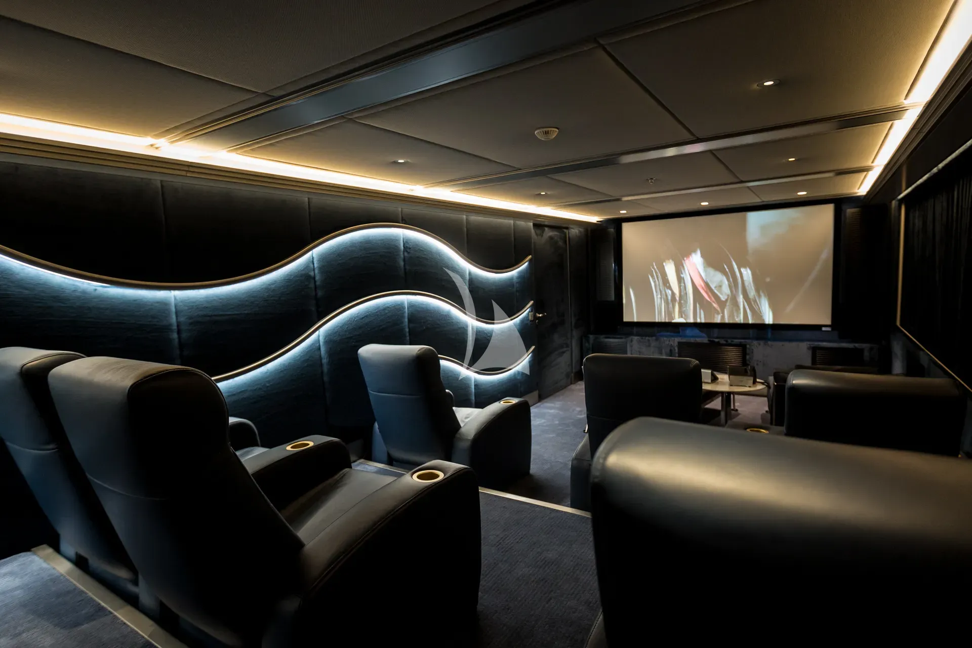 – Cinema room equipped with 100′ 4K screen projector, 7.2 surround sound and a karaoke system, which can accommodate up to 11 guests in 9 electrically reclining cinema seas and two lounge chairs.
