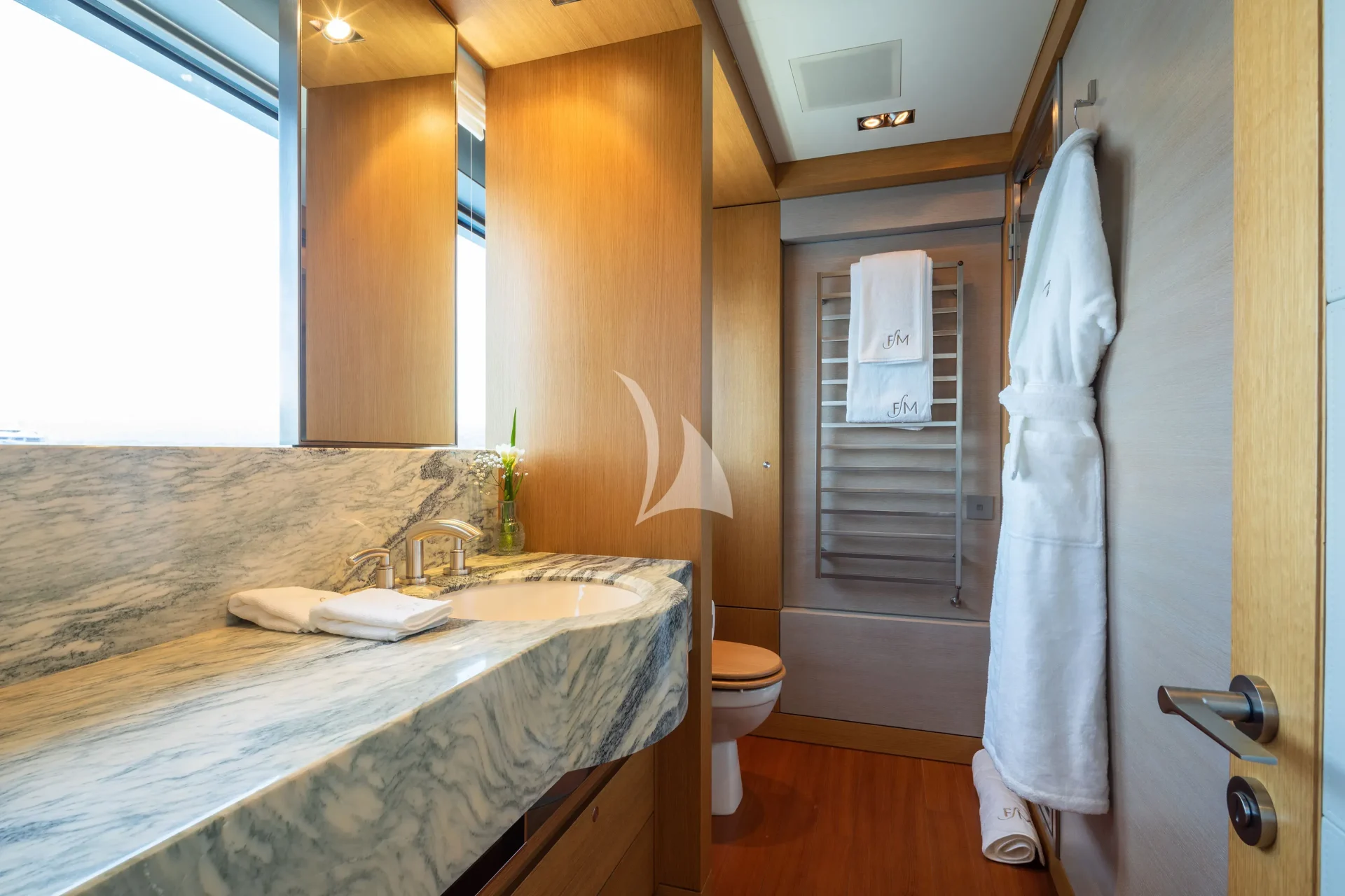 Moving on to the interiors, the new contemporary design has been refined with modern artwork and is complimented with brand-new upholstery fabrics throughout the yacht. FALCO MOSCATA can graciously accommodate up to 9 guests in well-appointed staterooms with the utmost comfort.