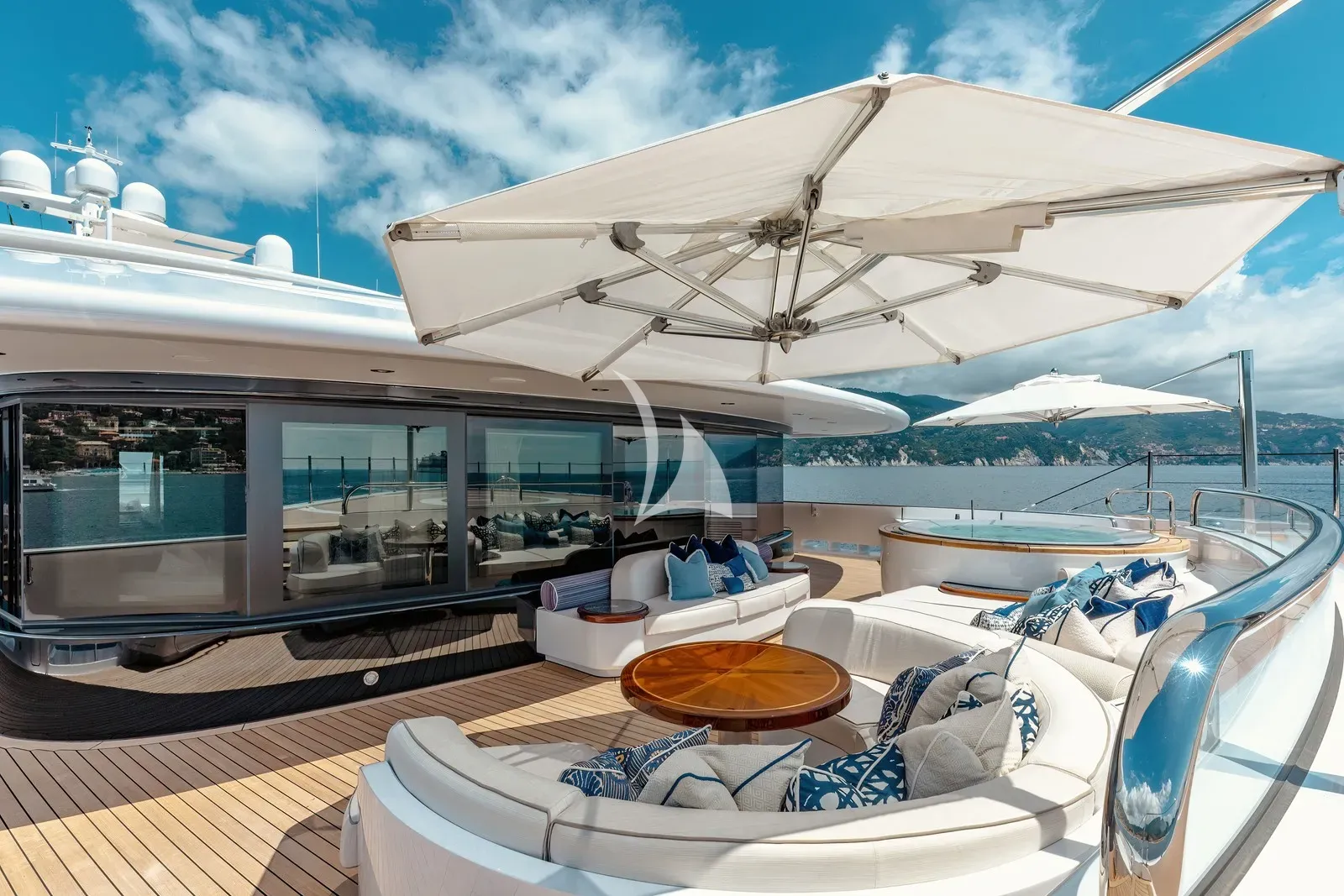 Careful consideration has also been given to privacy, with an entire additional deck; incorporating a lounge, dining, terrace with private jacuzzi, that can be reserved for the owner’s sole use. The owner’s suite offers panoramic views forward, as well as a study, his and hers bathrooms, walk in wardrobe, dressing room and its own private terrace.