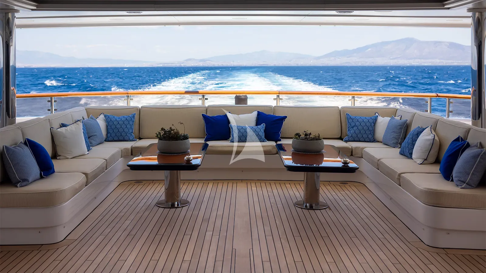 The yacht’s expansive sun deck is a focal point for leisure and socializing, featuring an inviting Jacuzzi, a fully stocked cocktail bar, and an array of oversized sun loungers. Whether relaxing under the Mediterranean sun or enjoying cocktails at golden hour, this area creates a refined yet relaxed vibe akin to a private beach club. An elevator connects all guest decks, allowing for effortless movement throughout the yacht and easy access to every space, from the sky deck to the waterline.