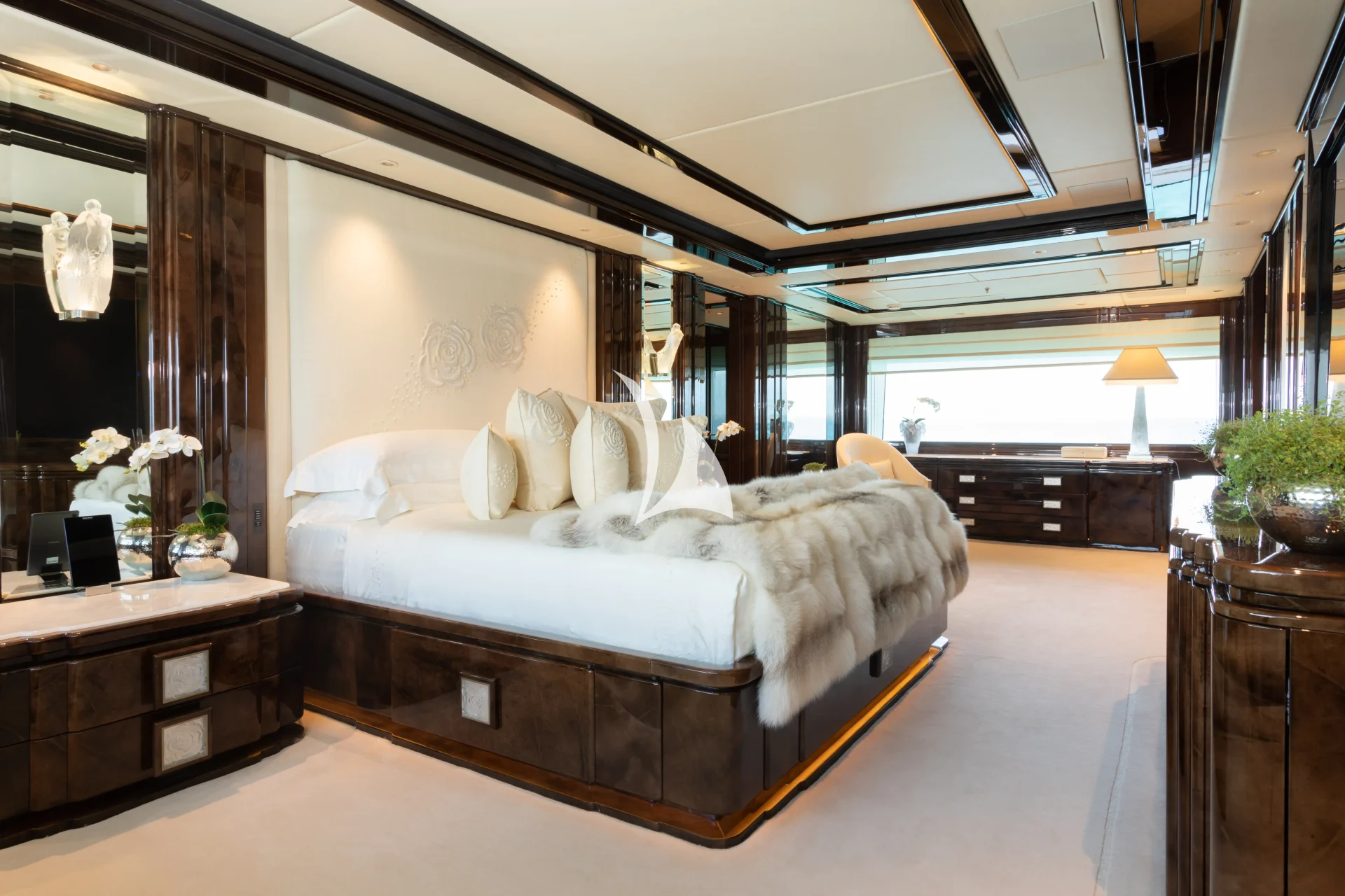 Designed to represent the epitome of elegance, Illusion V’s contemporary interior incorporates exotic materials such as walnut, onyx, Lalique crystal, parchment and silks, all of which create an inviting backdrop to the stunning vistas viewed from the full height windows. Boasting a massive master suite with study, full-width VIP stateroom and four large additional staterooms, she comfortably accommodates up to 12 guests. What’s more, she has an abundance of dining, entertainment and relaxation areas, a full bar and beach area on her lower deck, and the latest technology in stability and noise reduction.