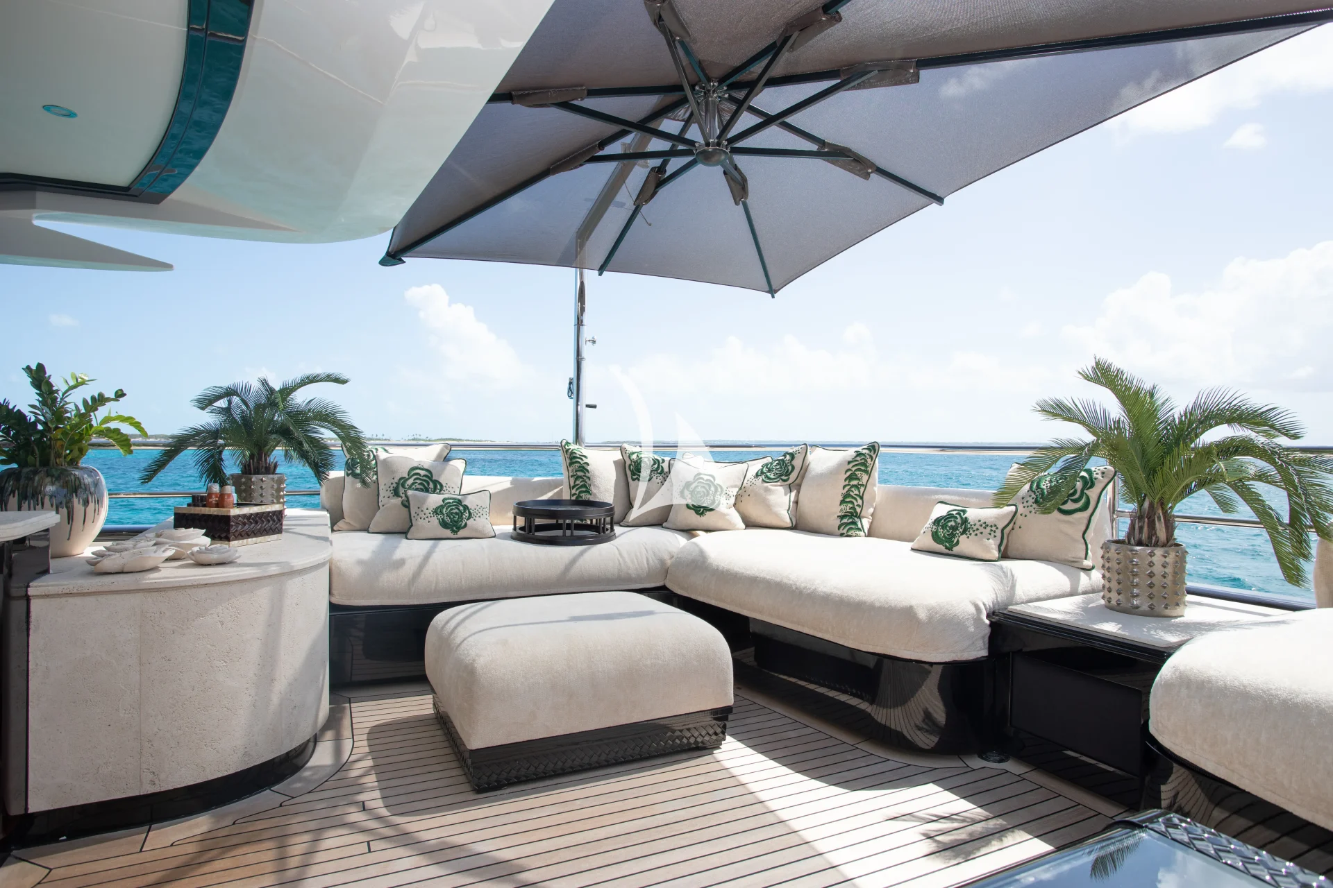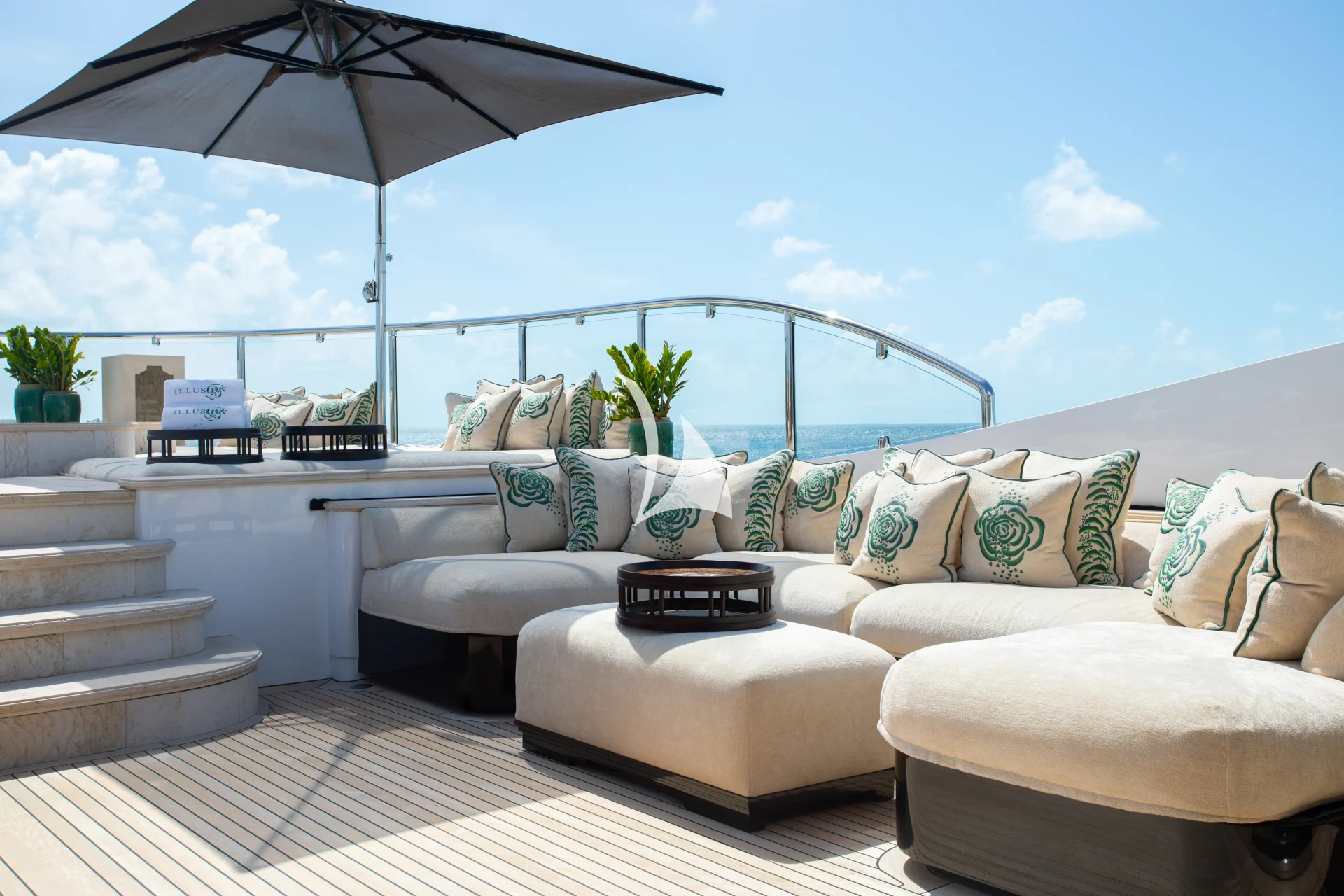 Up on deck, her spaces have been carefully planned for optimum privacy and comfort. Her sun deck is perfectly setup for ‘at sea’ entertaining and houses a large Jacuzzi, which is surrounded by sunpads, loungers, bar and barbecue. With such a long list of artfully crafted features – as well as an incomparable selection of water toys comprising a Jetsurf board, a Snuba and Scuba gear, fishing equipment and inflatables – there is no arguing Illusion V offers the finest in barefoot luxury.