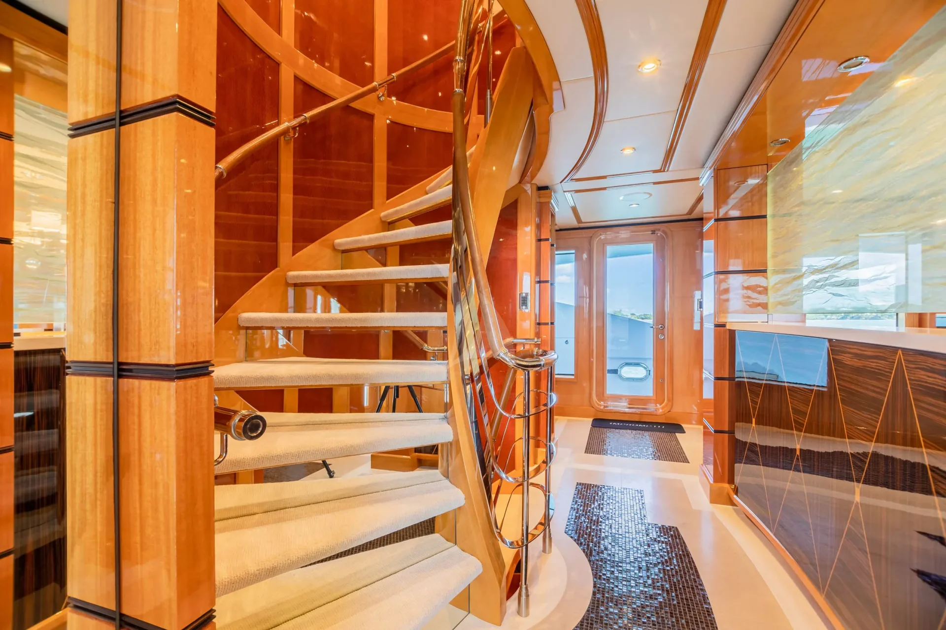 The main salon features an open-plan layout with generous seating and a dining area for 12 guests. A beautiful spiral staircase houses a dedicated wine cellar, adding a touch of sophistication. A raised conversation area on the main aft deck provides cool air conditioning and comfortable seating. Dual staircases lead to a large swim platform and a tender/toy garage. Those with a taste for adventure will appreciate IMPROMPTU’s seemingly bottomless toy chest of exciting watersports toys and inflatables.
