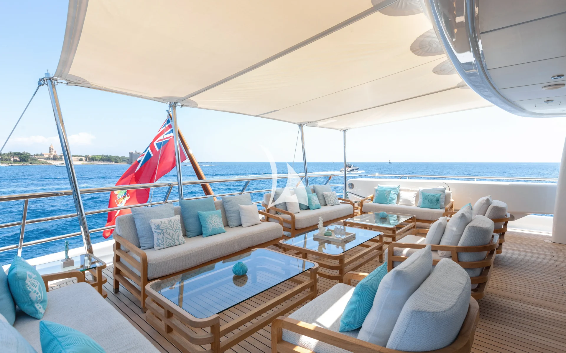 Her cool, contemporary interior offers 12 guests accommodation over six cabins in a configuration of one full beam master suite, one VIP, one double and three twin cabins. The latest audio visual equipment including WiFi features throughout and large communal spaces in the saloon and sky lounge make it a wonderfully social yacht. Throughout her bright interior expect white washed walls with bursts of colour such as nautical blue, vibrant coral and olive green.