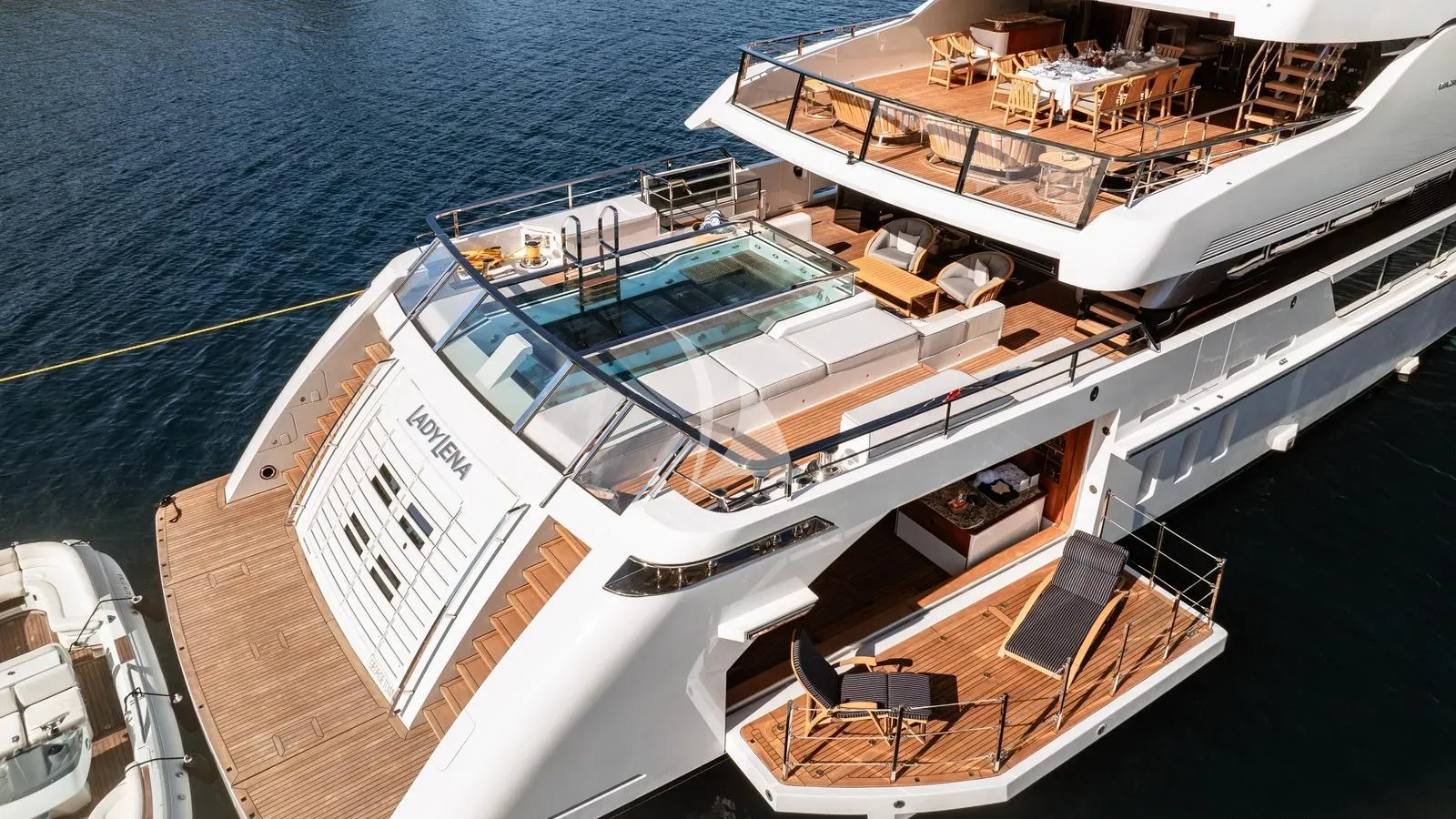 All of Lady Lena’s outdoor spaces are superb. The 90sqm sundeck embraces its position at the top of the vessel, with panoramic views from the 8-seater jacuzzi, sunbeds, informal dining space and relaxed seating. Meanwhile, the huge 80m2 beach club makes the most of its position on the water, with a float-in tender dock and fold out balconies, which give direct swimming access to the warm Mediterranean waters, and to the vessel’s huge range of water toys. However, the highlight of Lady Lena’s exterior has to be main deck’s stunning glass bottomed endless swimming pool.