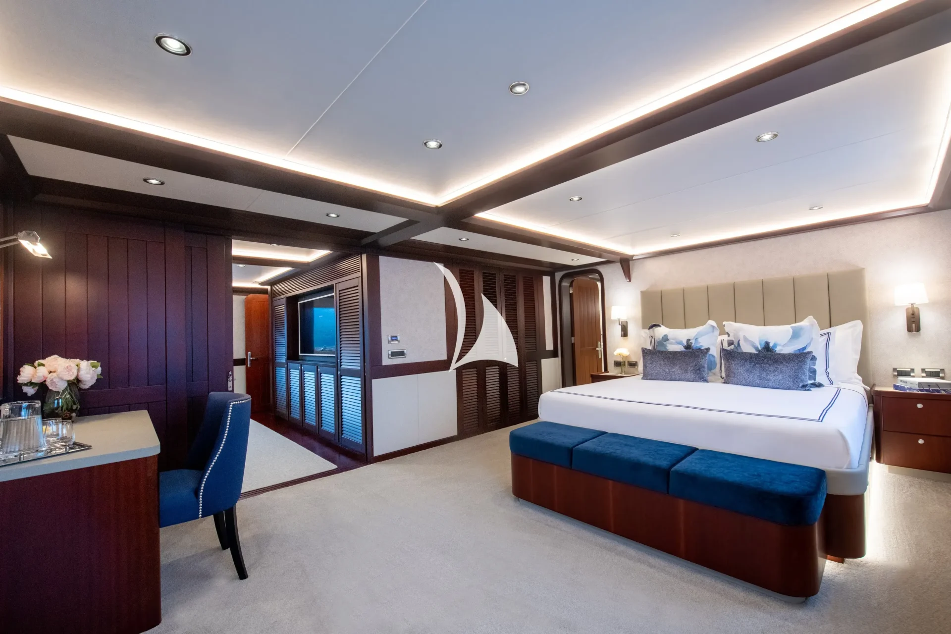 When it’s time for bed the master suite is up on the bridge deck with a private sitting room and a terrace overlooking the jacuzzi on the forecastle deck. The main deck is home to three double cabins and two convertible cabins, restfully decorated, completing adaptable accommodation for 12 guests.