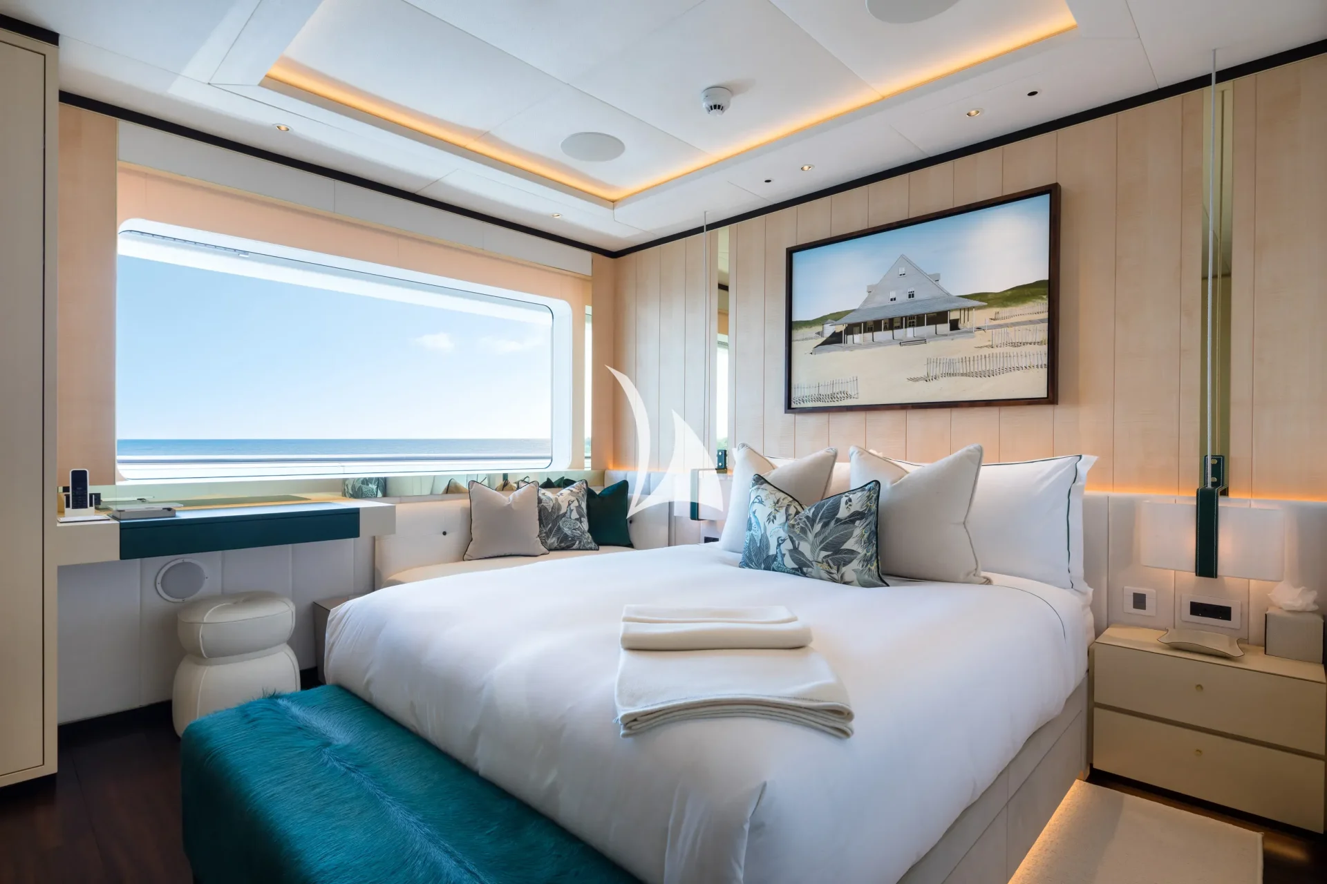 The full-beam owner’s suite features his and hers bathrooms, separate dressing rooms, lounge and private study. On the lower deck is versatile accommodation for eight guests in two VIP suites and two double cabins that can convert into twins, and there is a further guest double on the bridge deck.