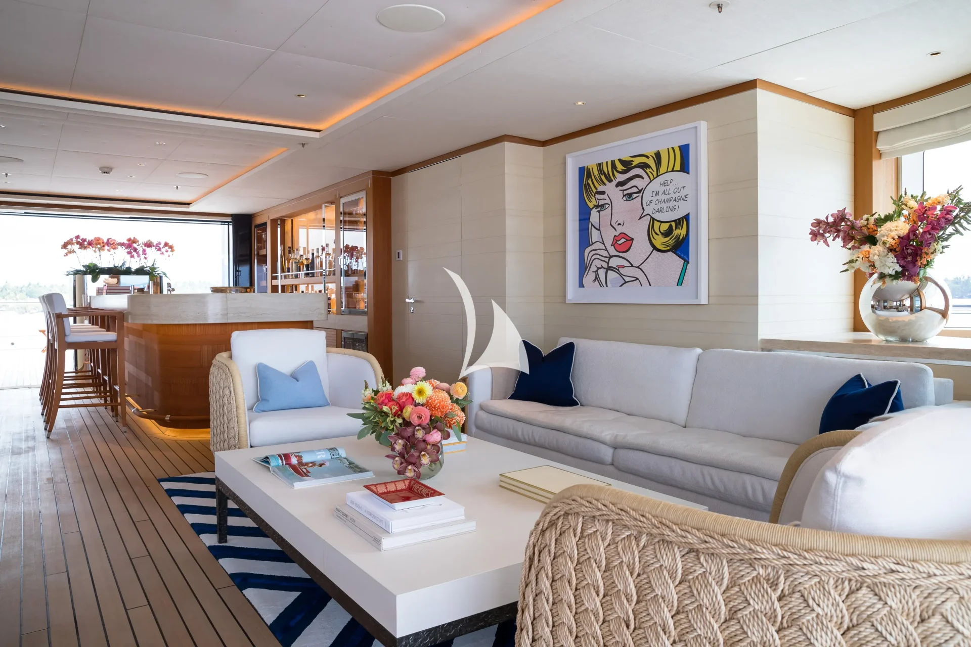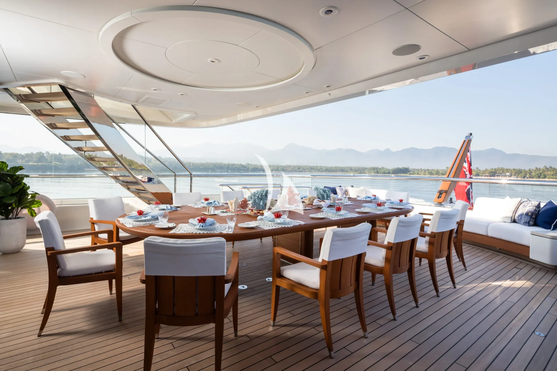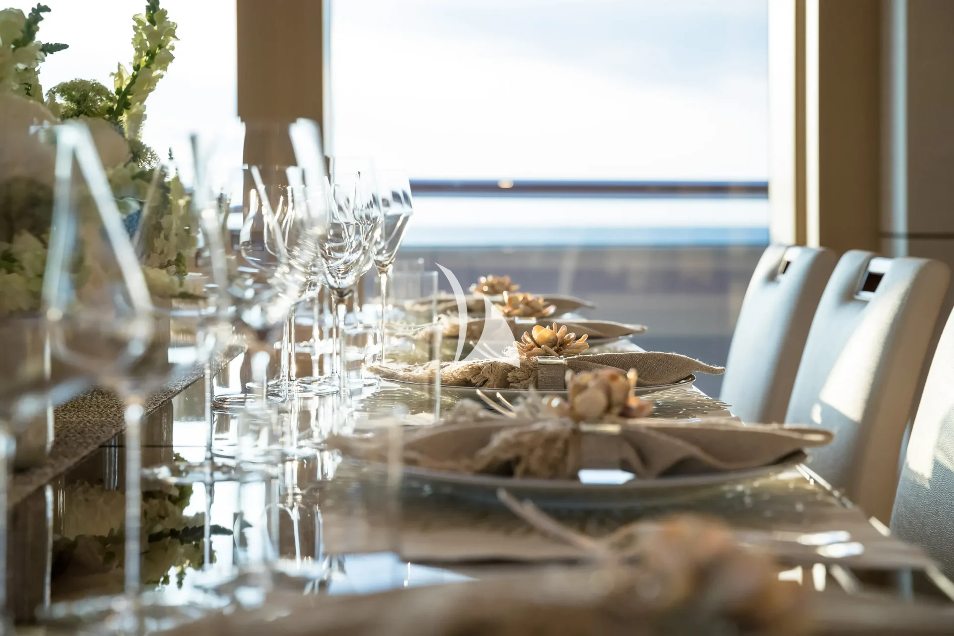 LUNASEA offers versatile spaces for entertaining, including al fresco dining options on the sun deck and bridge deck aft, and a formal interior dining area in the main salon.