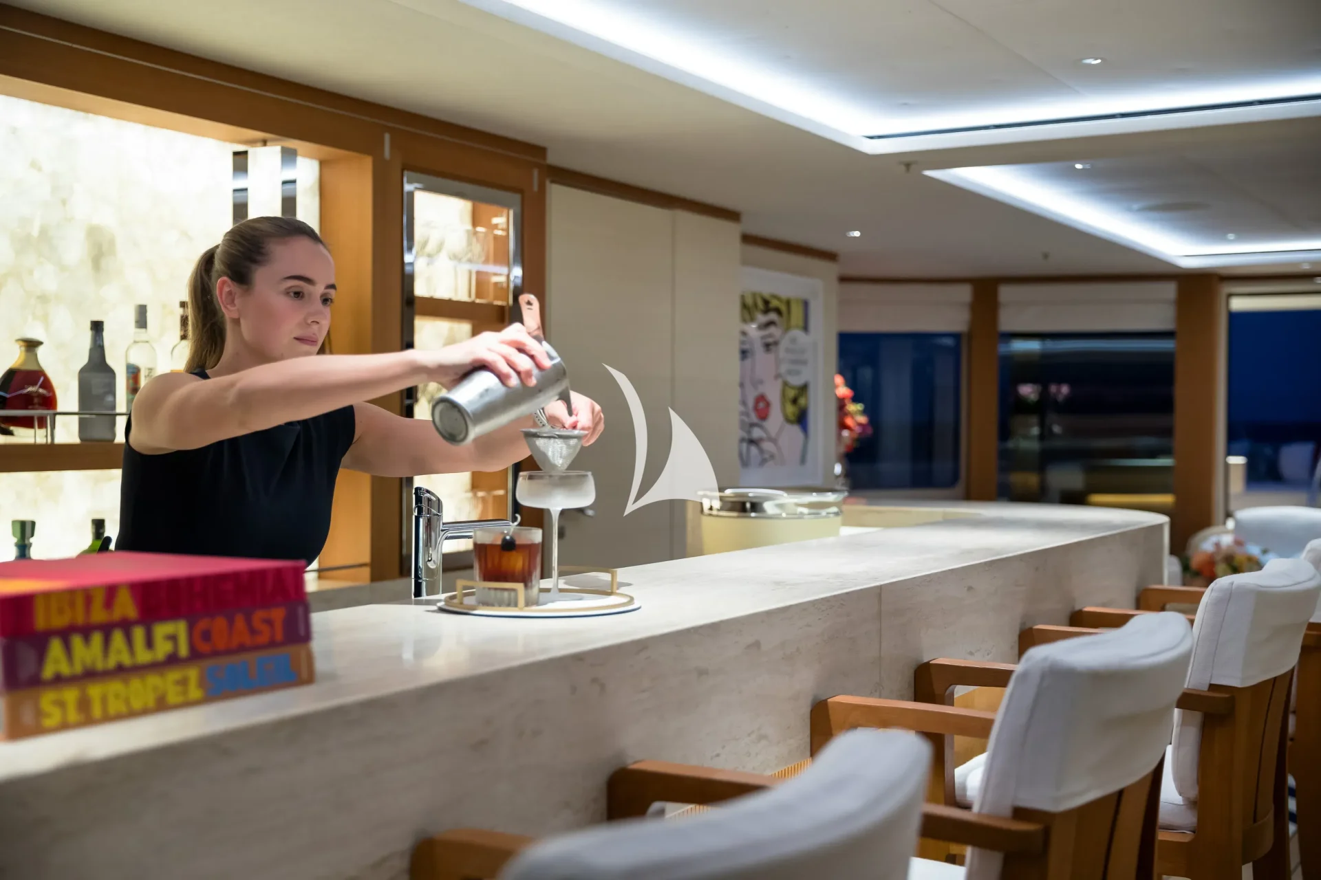 Her stand-out features include an 8m infinity pool on the main deck aft and a spiral staircase that leads down to a beach club with gym equipment and a dedicated wellness centre with a massage / treatment room. She also has a 9-seat cinema on the main deck, an impressive sundeck featuring a walk through lounge with indoor/outdoor bar and a jacuzzi. There is also an elevator between the lower, main and bridge decks.