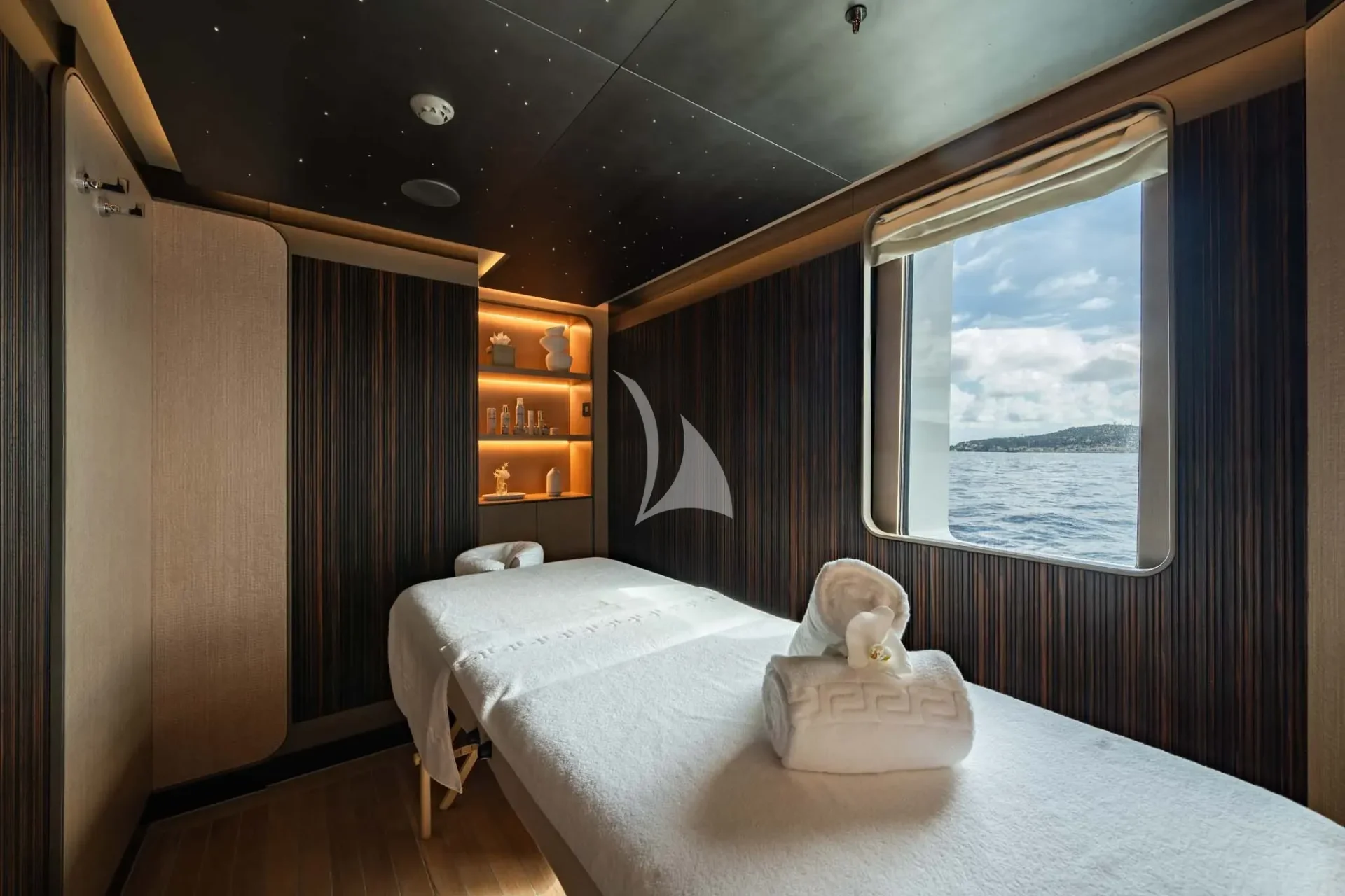 MALIA offers endless options for indulgence and entertainment. Carve in a workout at the state-of-the-art gym on the sundeck level, followed by an afternoon of tranquility in the sauna, Turkish hammam, and massage room in the beach club. The glass-bottom pool on the main deck aft, positioned above the beach club, allows natural light to cascade into the space below. Further use of glass is seen on the glass-enhanced Jacuzzi on the sundeck. The yacht further boasts an outdoor theater, an exterior lounge/bar area, and numerous sunpads for relaxation. Each deck is adorned with loose furniture, enhancing the overall experience. MALIA is equipped with an elevator for ease of movement between lower deck, main deck and bridge deck, satellite communications and Wi-Fi connectivity.