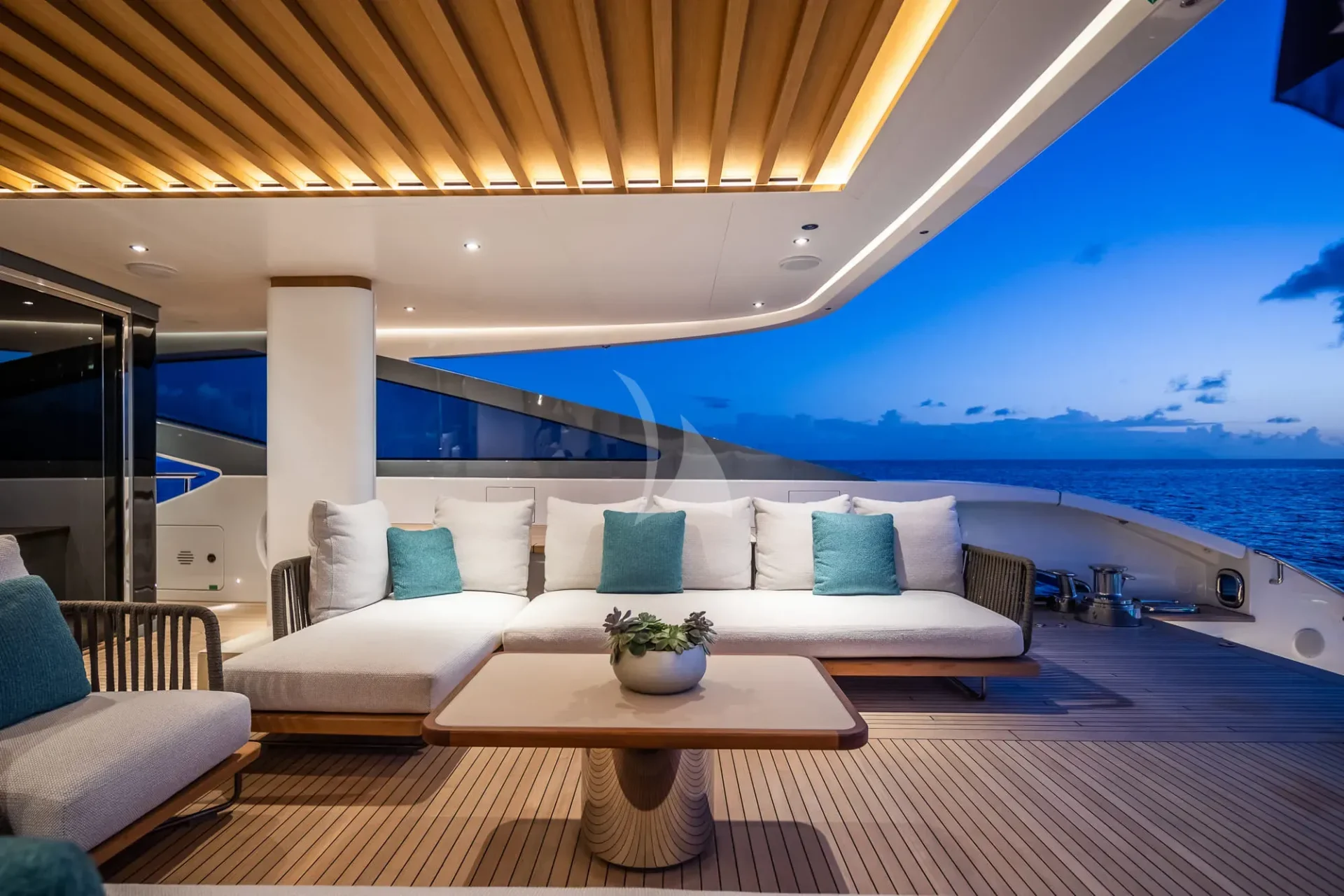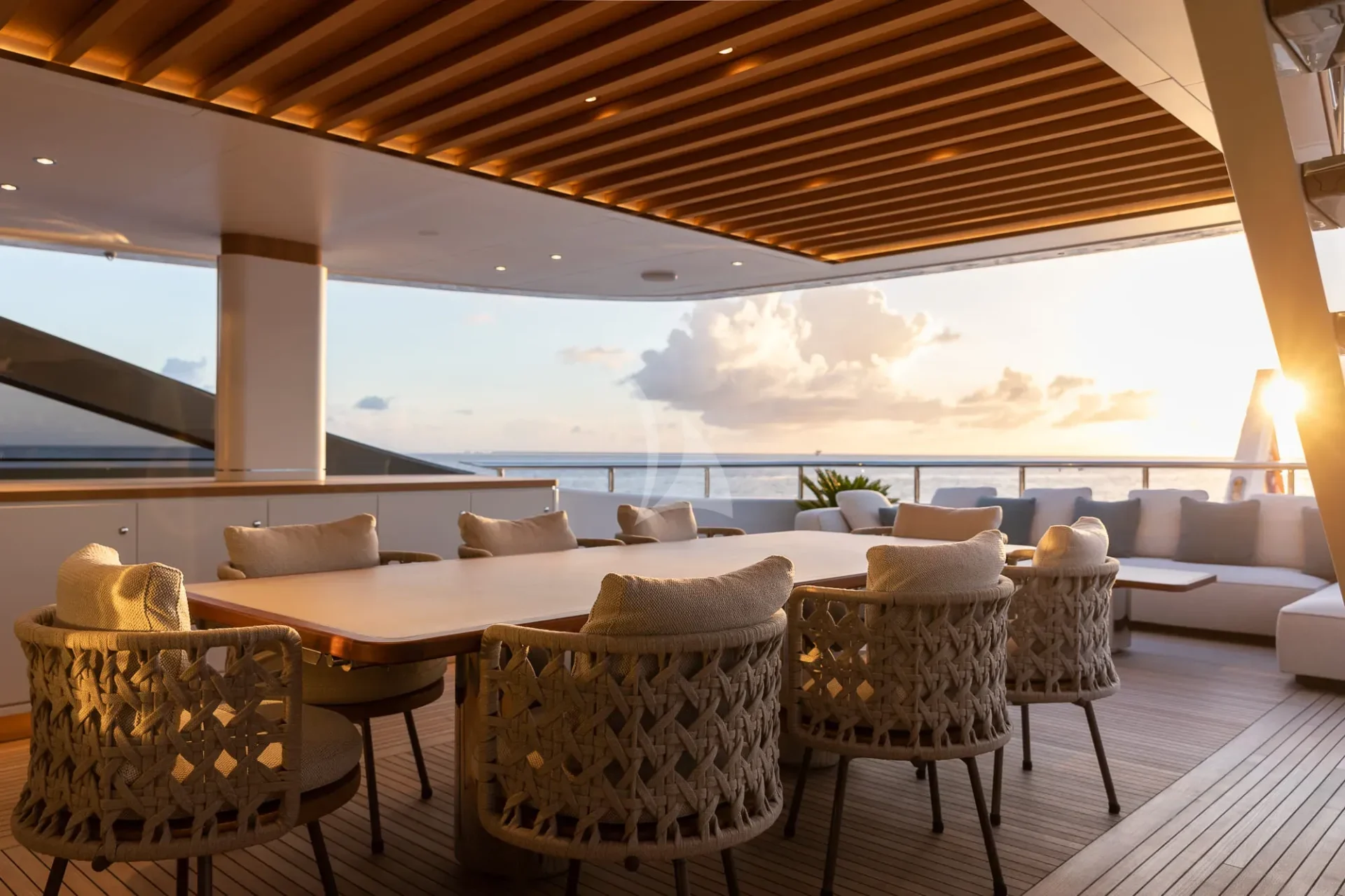 The primary alfresco dining space on board is on the upper deck aft, where lies a rectangular table along with more lounging space – perfect for enjoying late-night drinks in comfort.