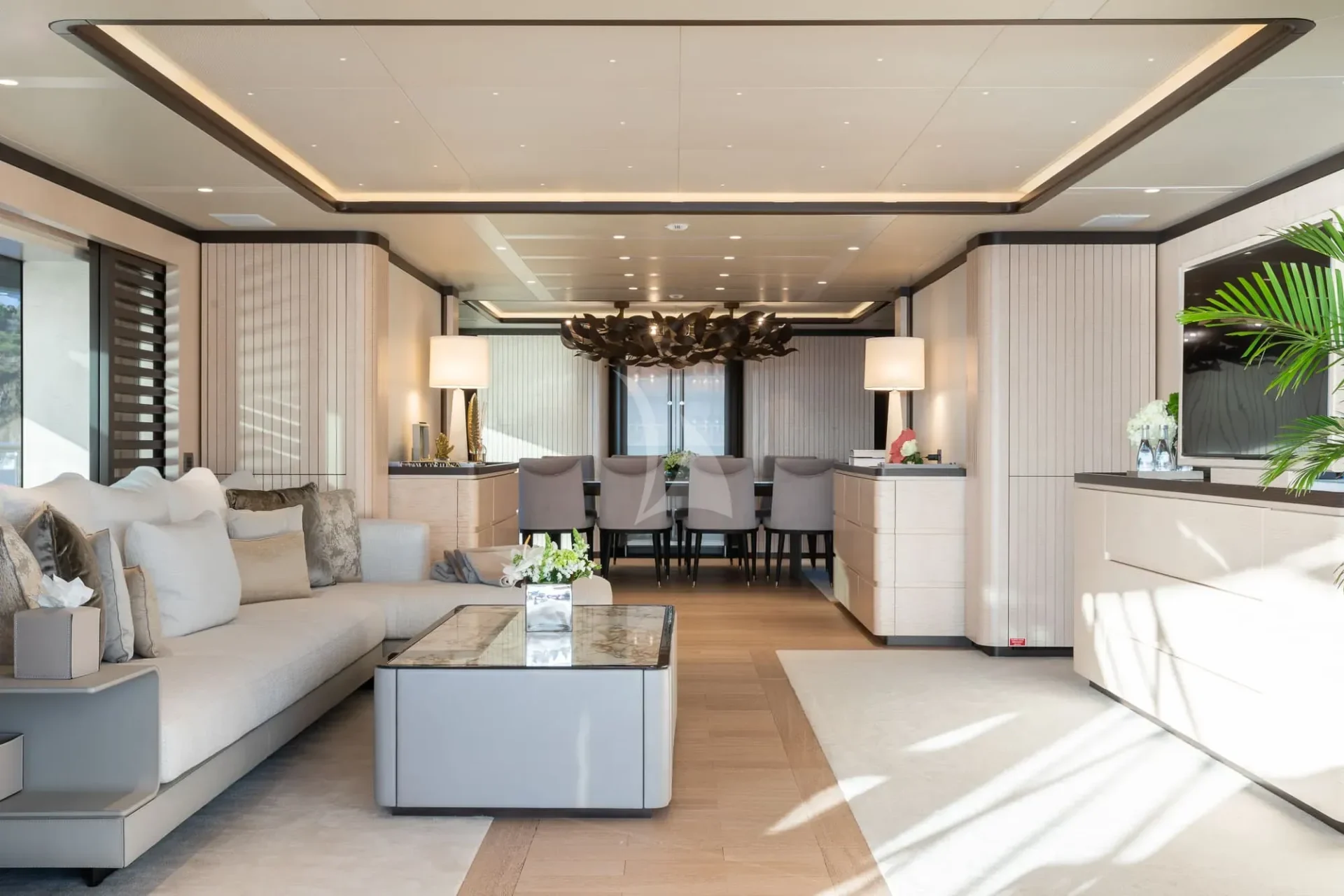 Designed by RWD to maximise the outdoor spaces, she features a main deck panoramic pool lounge area and a 36 sq m aft beach club with large infinity pool, “sea saloon” and fully-fledged hammam.