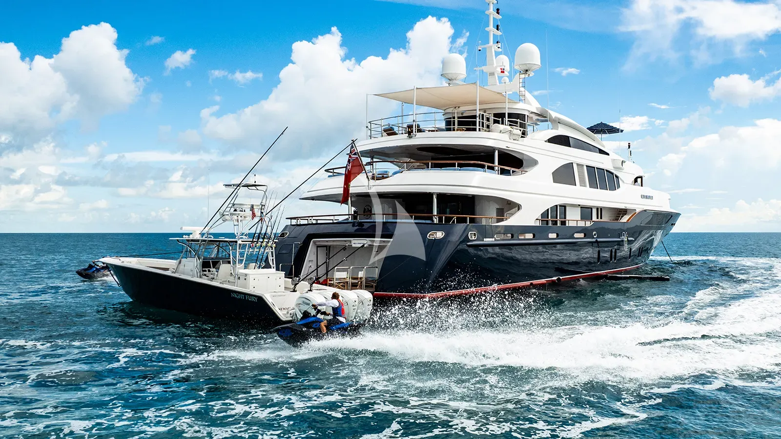 Designed by Italian designer Stefano Natucci, the interior throws an abundance of natural light, while the exterior provides plenty of shade. She offers a full complement of water sports equipment and tournament fishing gear. Her experienced crew of 15 will provide unparalleled service and expert fishing guidance and entertainment.