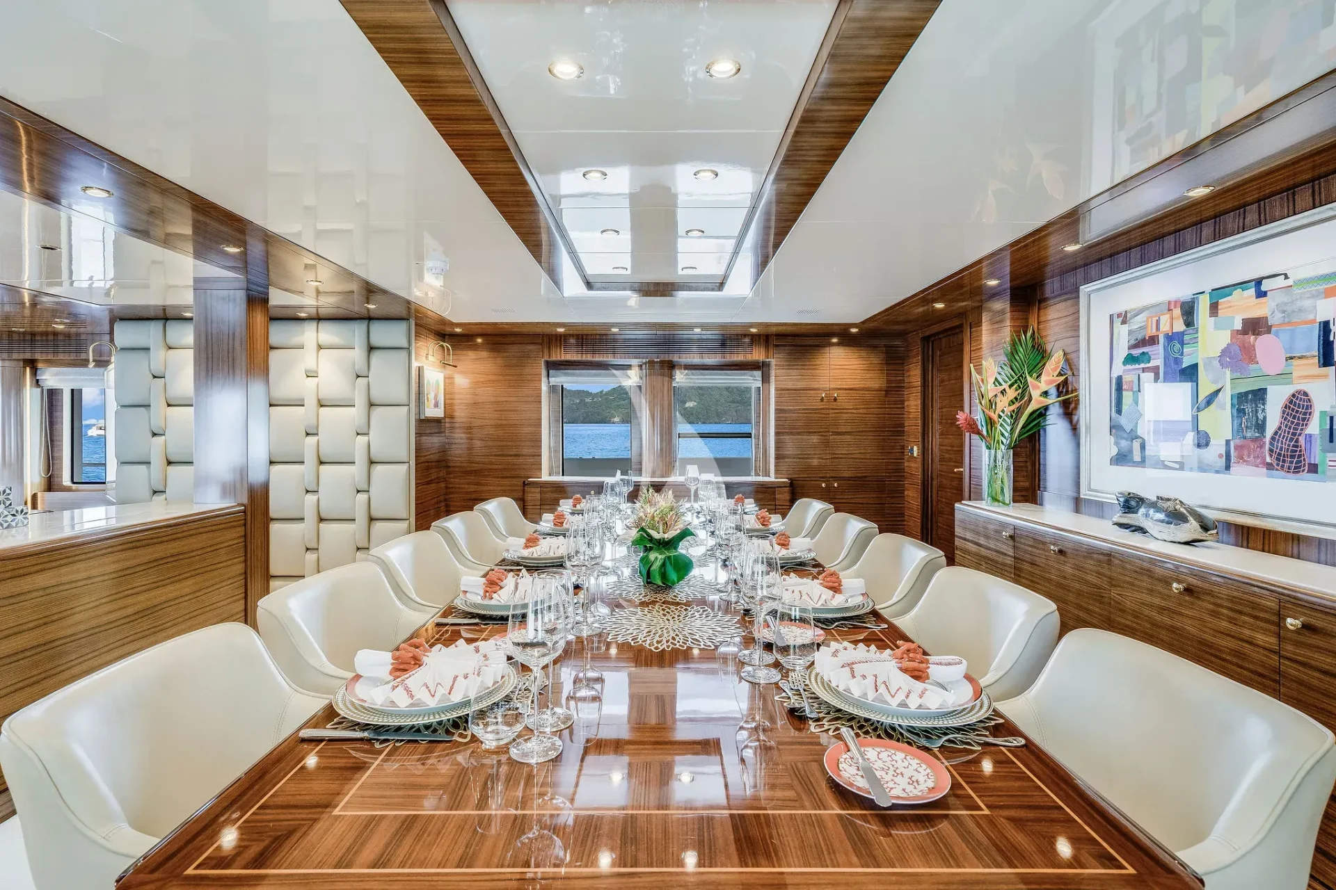 Able to accommodate 12 guests, she features an impressive Owner’s suite on the upper deck with one of the best offices to be found on any yacht. She boasts a child-friendly setup with a VIP cabin on the main deck, two double cabins and three twin cabins.
