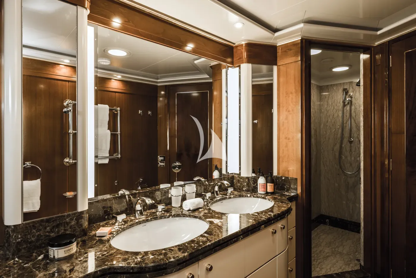 The forward-facing Master suite includes a study, hair salon, walk-in closet, his and her bathroom with whirlpool tub, and a private 180-degree observation lounge. The remainder of guests are accommodated across one VIP stateroom, two double cabins, two twin cabins and two single cabins for extra staff, all with ensuite.