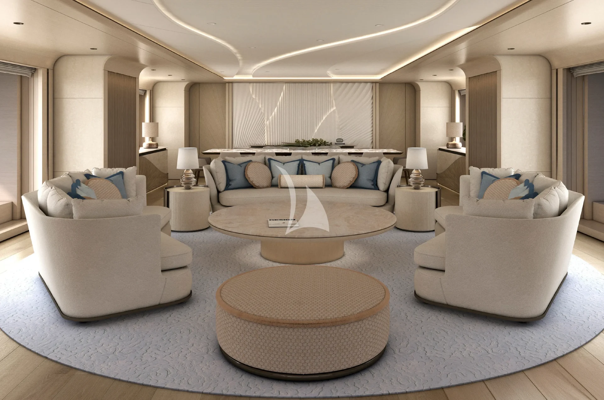 Guests can recharge in style or unwind in the sundeck Jacuzzi with panoramic views. The sundeck features flush deck doors that provide a smooth transition between indoor and outdoor spaces. This versatile area includes a gym with en-suite facilities, a fore-lounge with a custom-designed jacuzzi, sunbeds, and an outdoor cinema with a projector. Fitness and wellness are at the forefront aboard this magnificent charter vessel. A standout feature is the innovative beach club, which includes a spa lobby bar and lounge, a hammam and ample storage for water toys.
