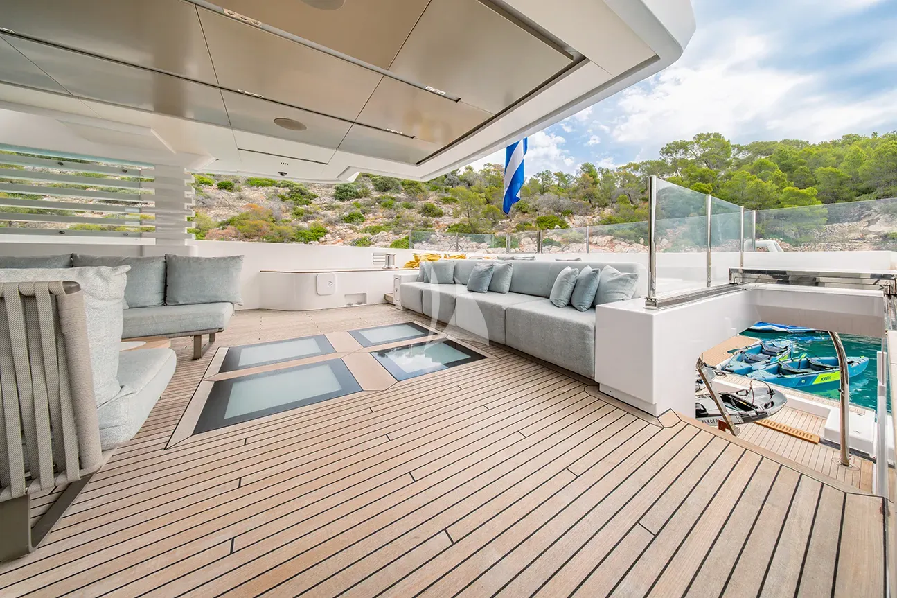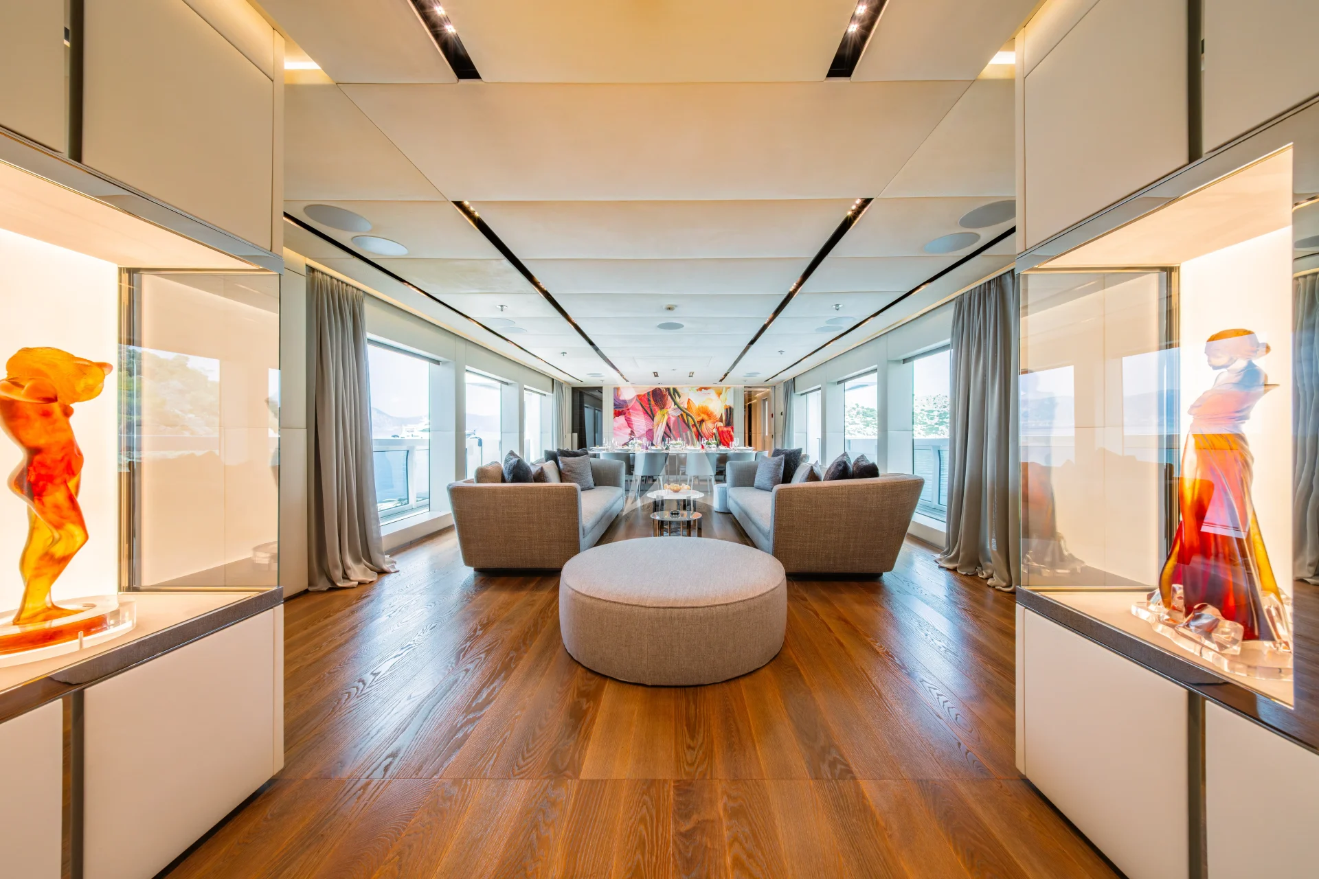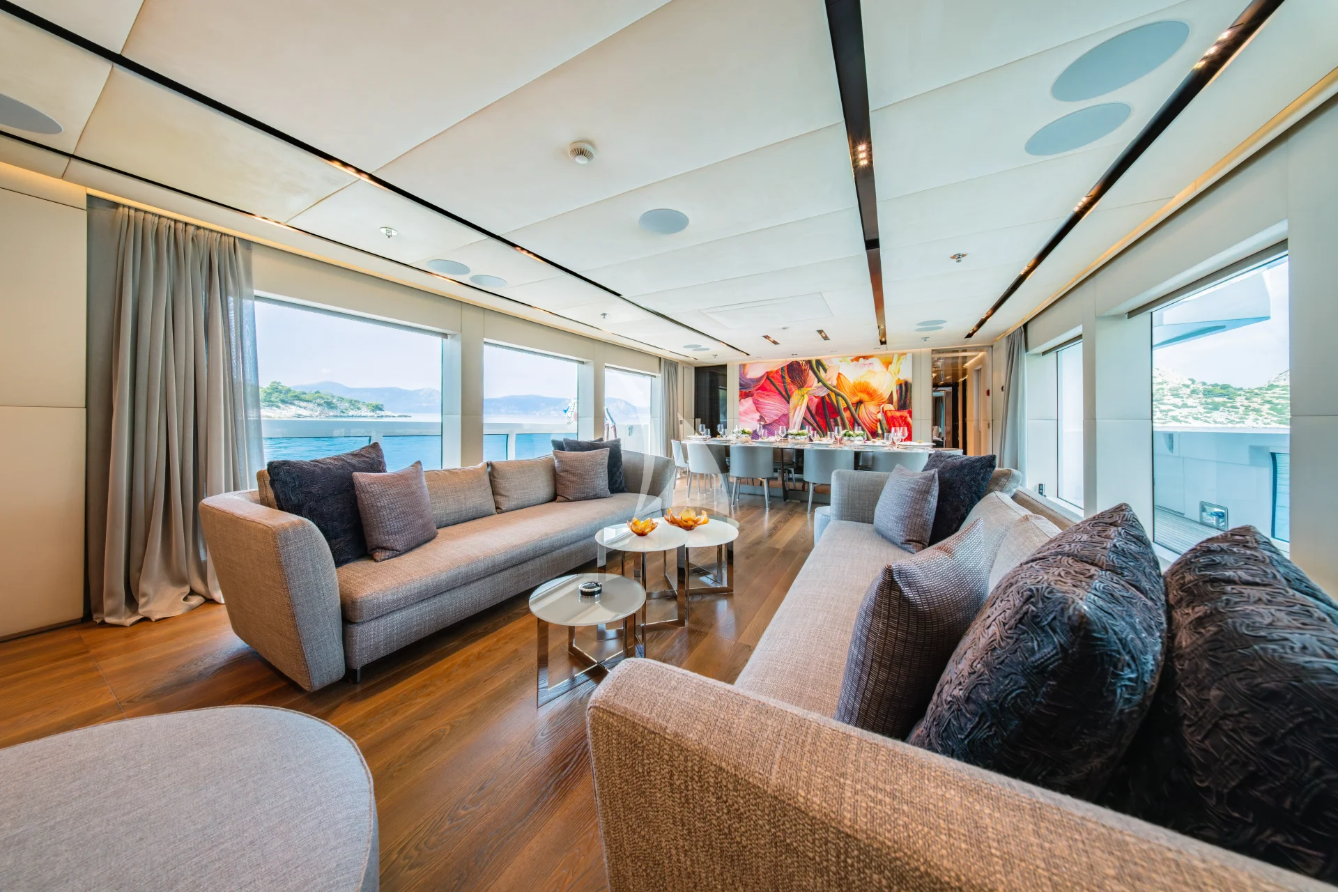 OURANOS boasts one of the largest beach clubs in her class, upgraded and fully equipped for lounging, wellness, or water sports access. Her expansive exterior areas include multiple alfresco lounges, a spacious Jacuzzi on the sundeck, and two full-beam salons ideal for entertaining or simply soaking in the scenery. Signature full-headroom windows along both main and upper salons blur the line between indoor and outdoor living, creating a stunning connection to the sea.