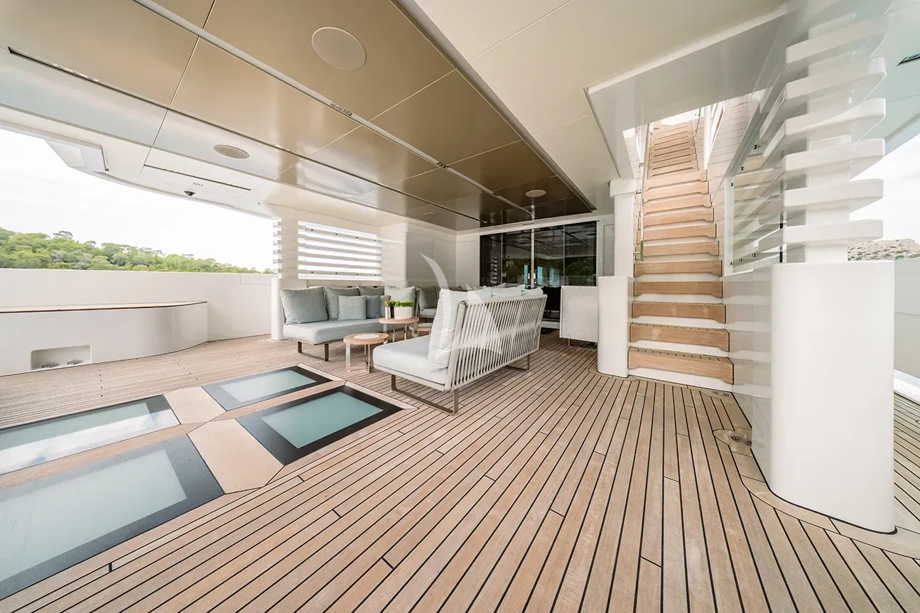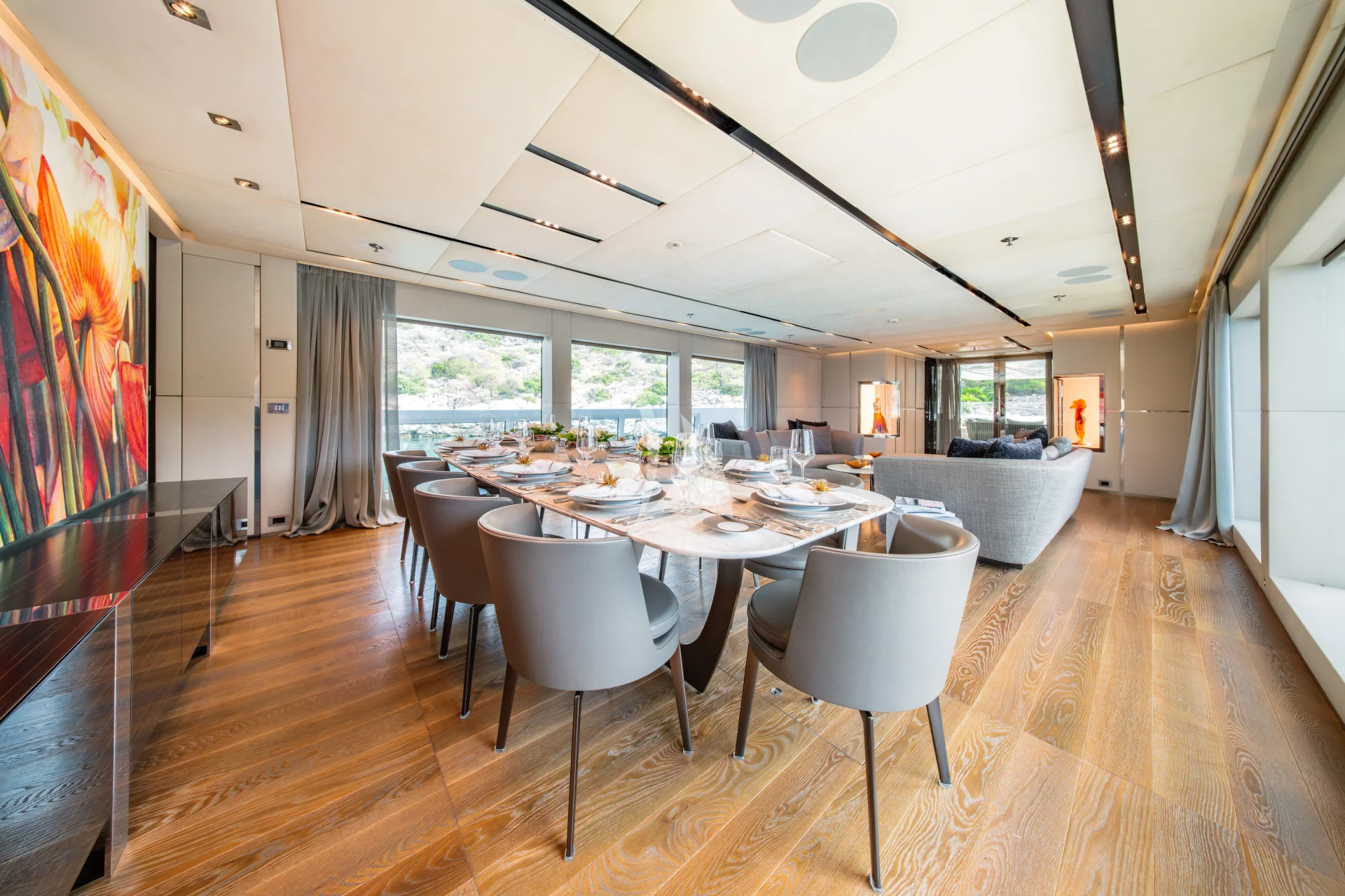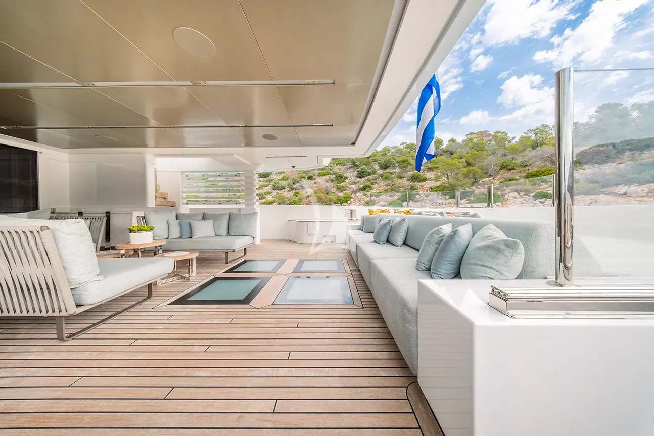 OURANOS boasts one of the largest beach clubs in her class, upgraded and fully equipped for lounging, wellness, or water sports access. Her expansive exterior areas include multiple alfresco lounges, a spacious Jacuzzi on the sundeck, and two full-beam salons ideal for entertaining or simply soaking in the scenery. Signature full-headroom windows along both main and upper salons blur the line between indoor and outdoor living, creating a stunning connection to the sea.