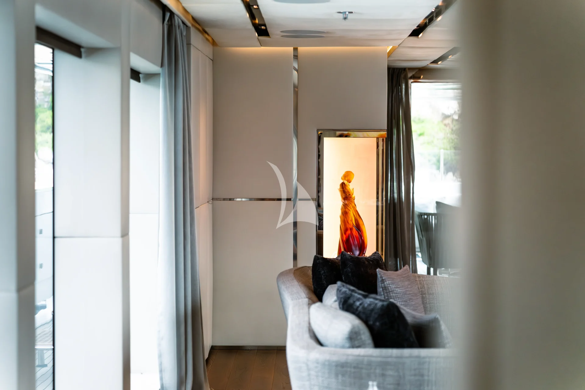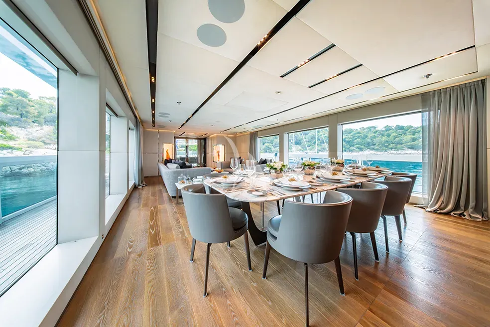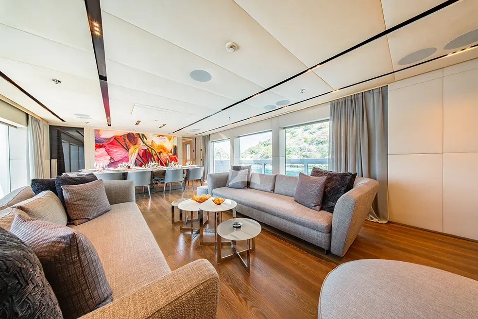 Accommodation includes six spacious cabins for 12 guests, with a vast master suite and three VIP cabins, all fitted with sleek lines, soothing tones, and state-of-the-art tech. A wheelchair-accessible gangway and glass elevator connecting all interior decks ensure inclusive access for all guests. The iPad-controlled entertainment system offers satellite channels, music, and an extensive DVD library across cabins, salons, and the sundeck.