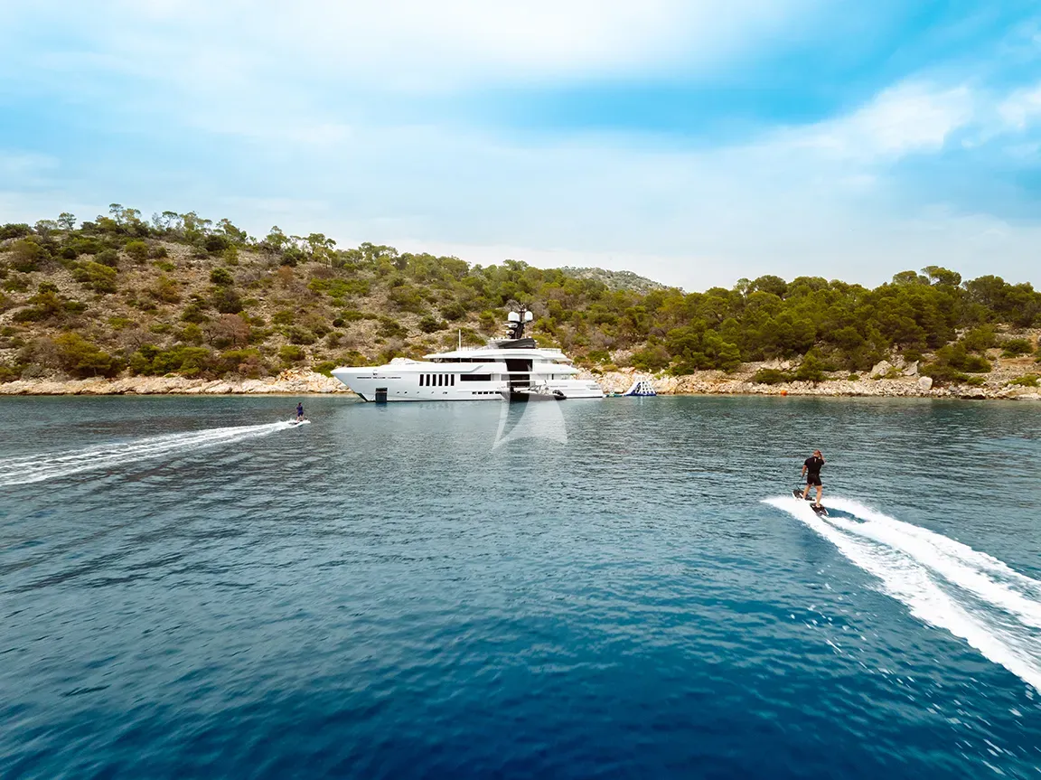 Refined design, thoughtful engineering, and an experienced, charter-focused crew make OURANOS one of the most compelling 50m yachts available for charter today. Built under 500GT yet offering expansive volume and wide open spaces, she’s a rare blend of style, silence, and seamless service. With a world-class crew of 13, including two accomplished chefs who have worked together for years, the guest experience aboard OURANOS is tailored to perfection. Her glass elevator, massive beach club, and tech-forward wellness facilities position her at the forefront of modern chartering; ideal for families, groups of friends, or multigenerational getaways.