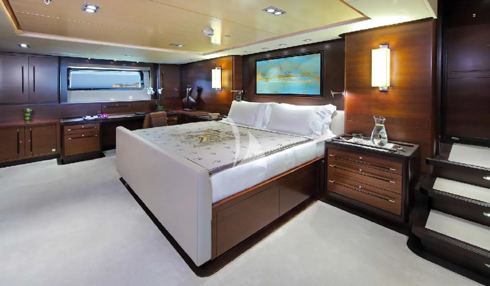 Inside, PRANA features chic, airy interiors designed by Redman Whiteley Dixon, incorporating rich woods and tasteful decor for a warm, welcoming ambience. The spacious main saloon provides the ideal setting for socialising or relaxing, and each of her cabins offers tranquility and privacy. The master suite is particularly outstanding, with an impressive layout that includes a walk-in wardrobe, dedicated study area and is en suite with a bath and shower. Whether you’re adventurous, keen to explore the warm Mediterranean waters with the yacht’s extensive collection of water toys, or to simply seek peaceful relaxation, PRANA provides a memorable charter experience tailored to every taste.