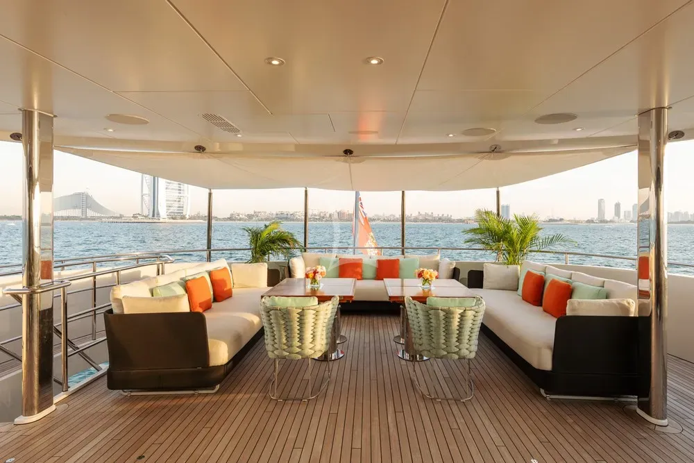 Her sun deck has a large jacuzzi forward flanked by sun pads and surrounded by glass screens. Aft, under skylights, is a genuine sky lounge with walk-up bar, picture windows and large sliding glass doors fore and aft, making it a wonderful place for dining under the sun or the stars in any weather.