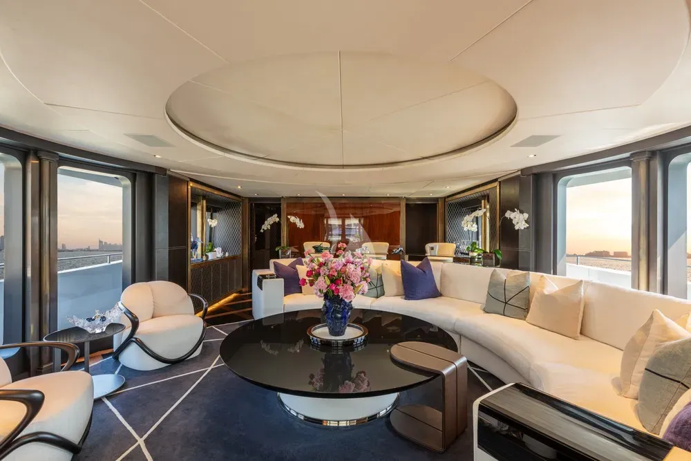 To starboard of sun loungers on the sun deck aft, stairs lead down to the bridge deck aft where there is a large entertaining space, which can set up as an al fresco dining space for 12 or a convivial afternoon lounge with more seating aft. Sliding doors lead into a spectacular circular lounge with 270-degree views and a large TV with surround sound for movie nights, leading through to another entertaining space.