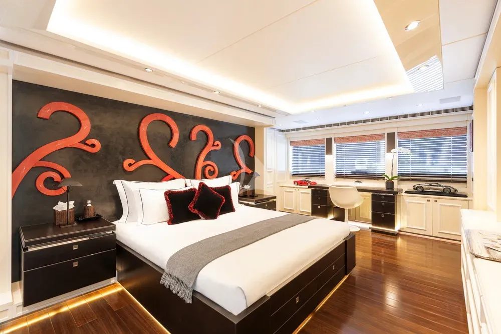 A magnificent statement staircase in chrome leads down to a backlit marble lobby on the main deck. Aft is the main lounge, a formal dining area and a cosy snug, leading through to another adaptable space on the aft deck, where steps lead down to the swim platform and its plethora of toys. Forward is the full-beam master suite, with his and hers bathroom with bath, a walk-in wardrobe, sofa to port and an office area to starboard.